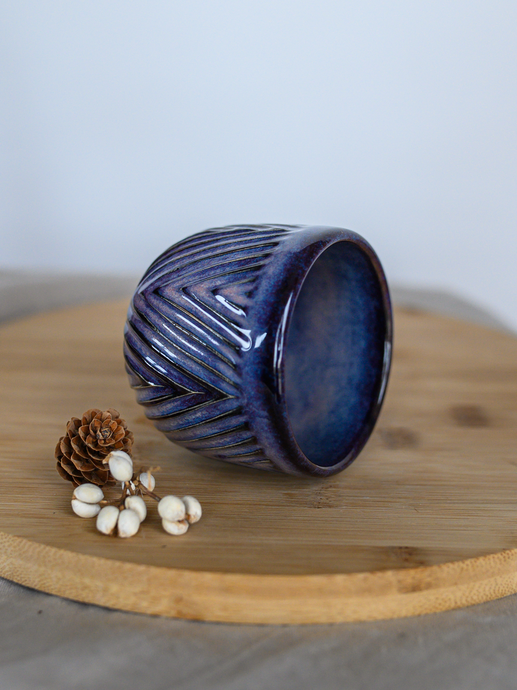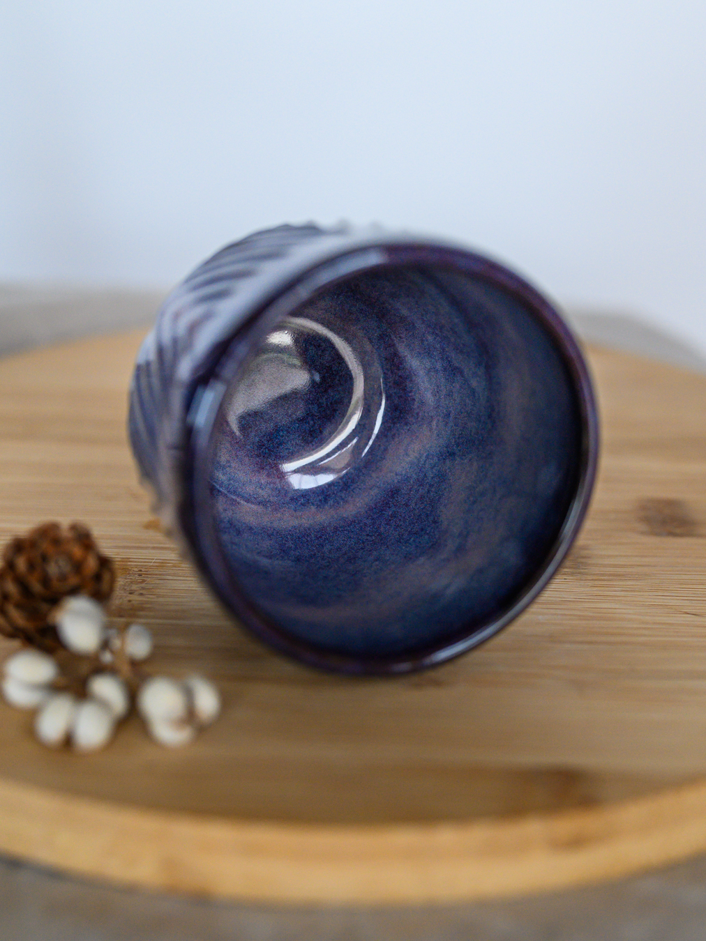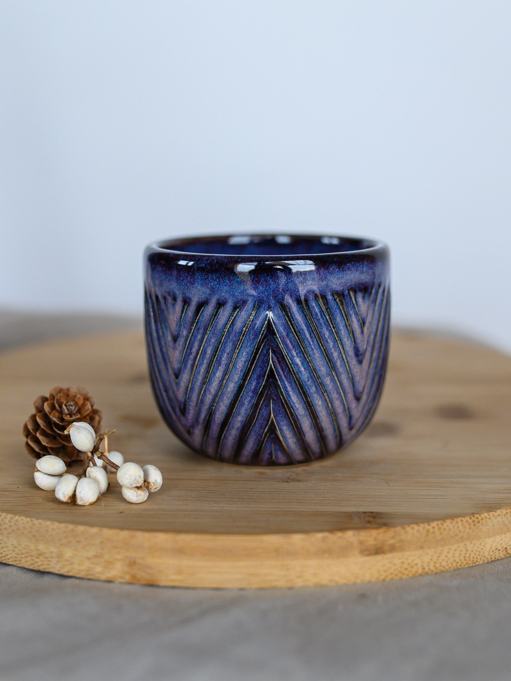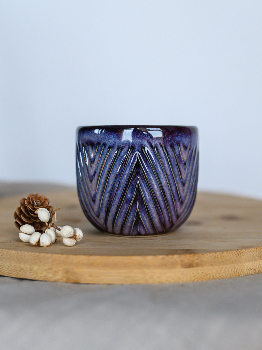 Czarka ze wzorem jodełki w odcieniach fioletu, uformowana na kole garncarskim z jasnej gliny.