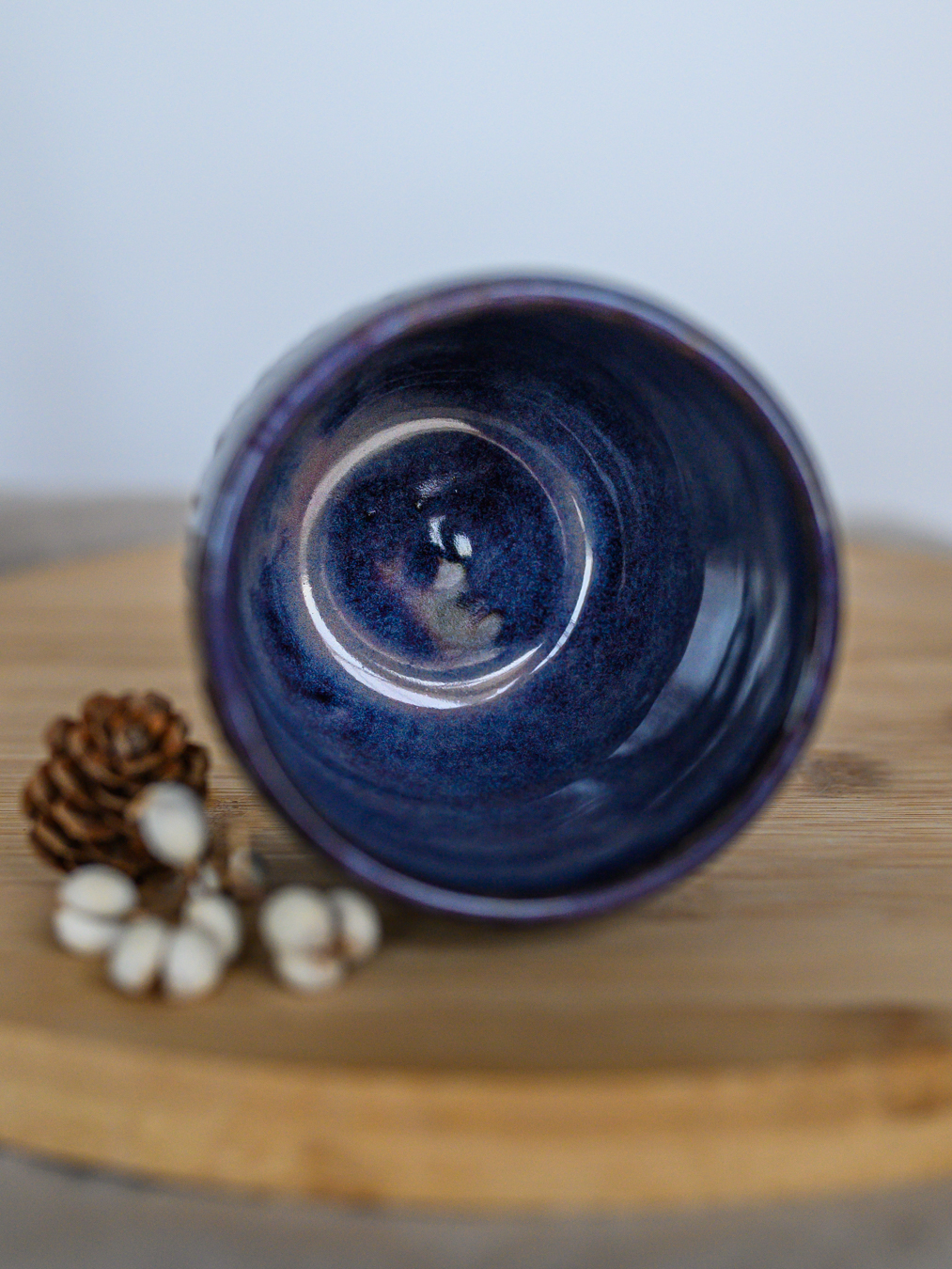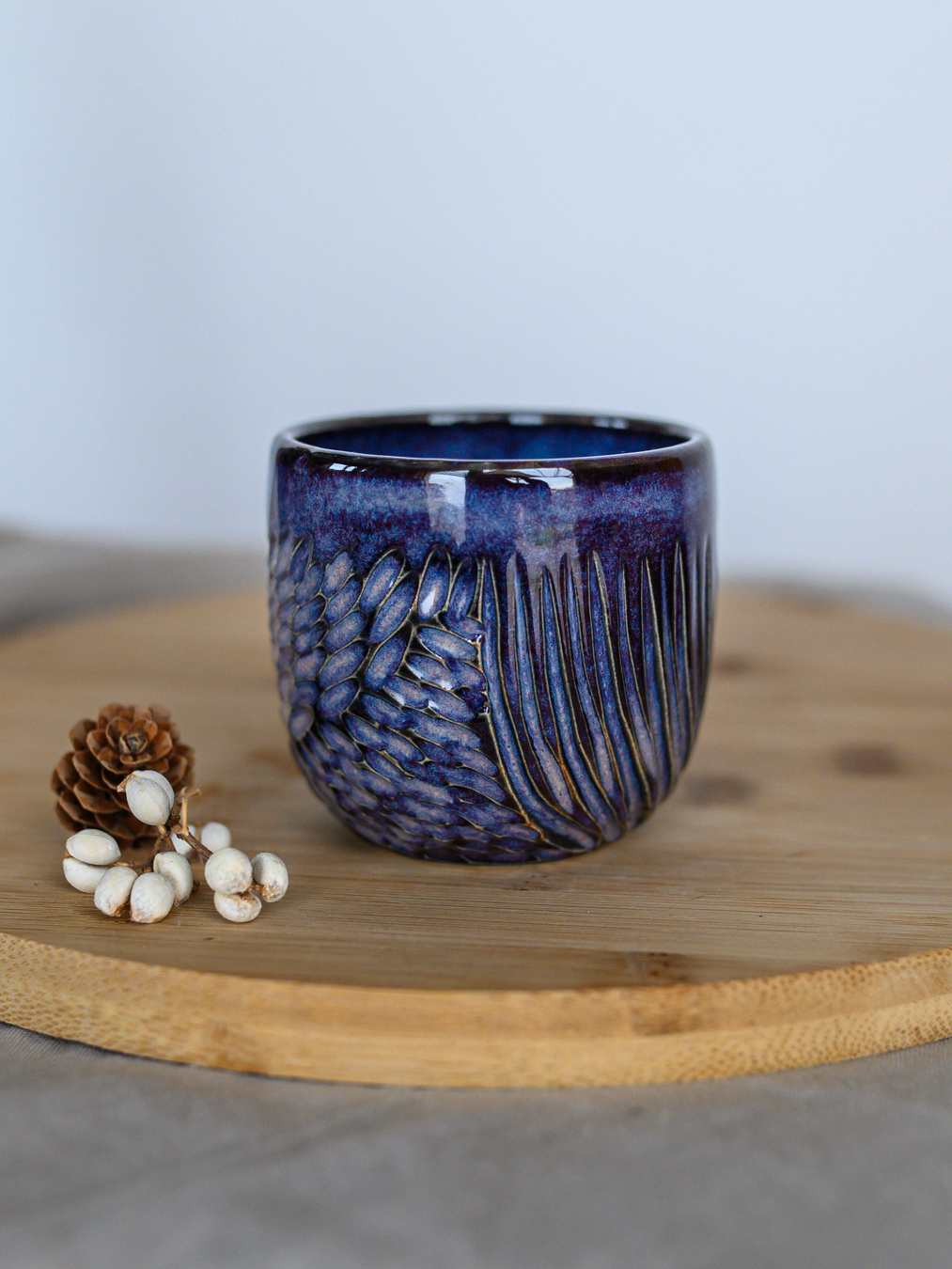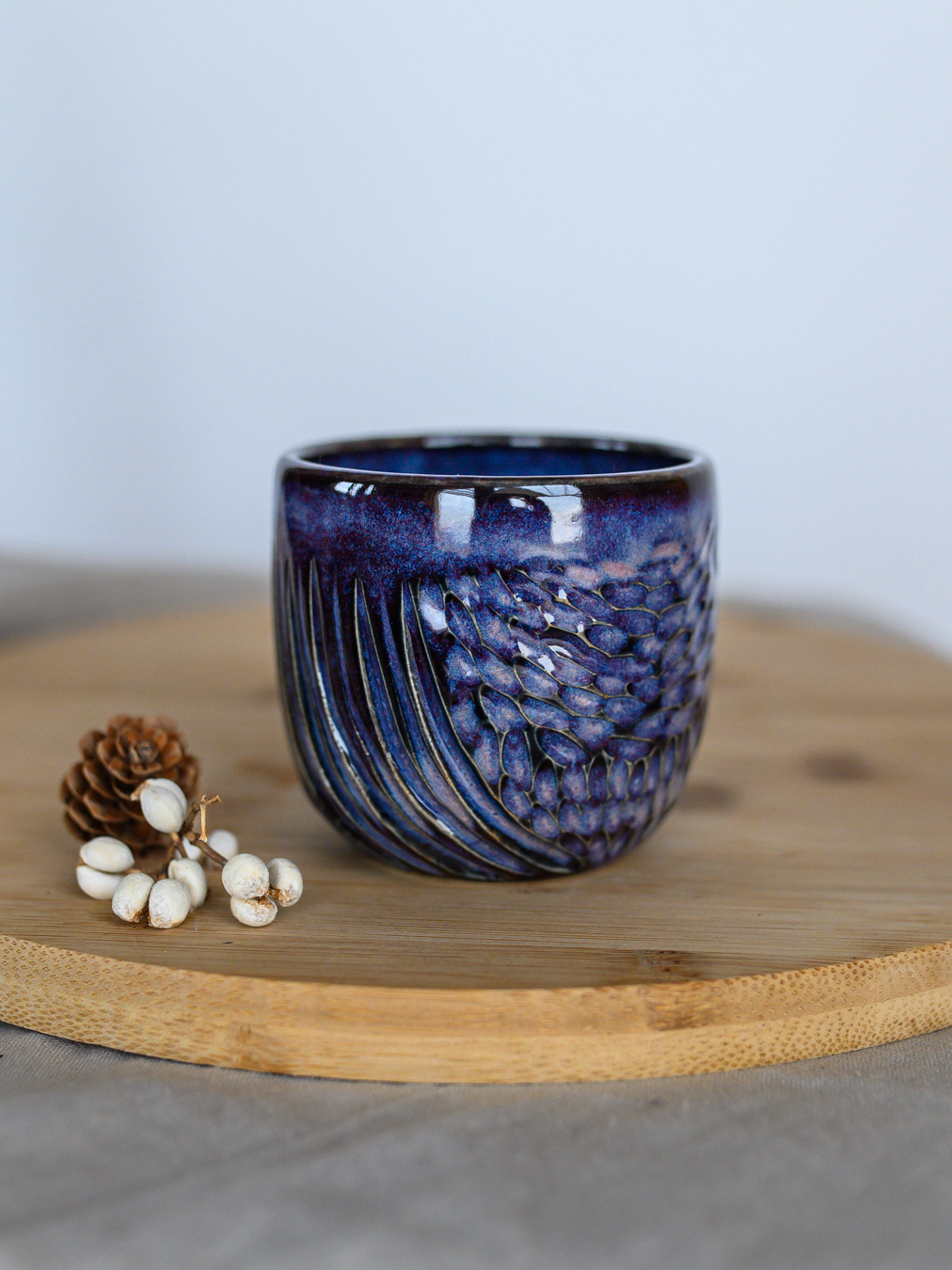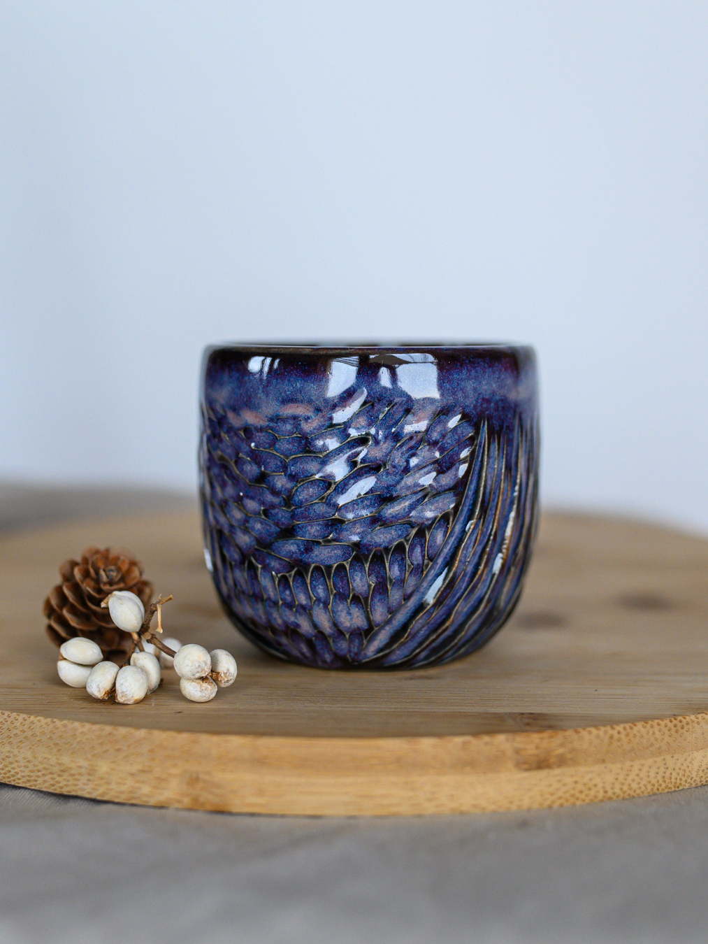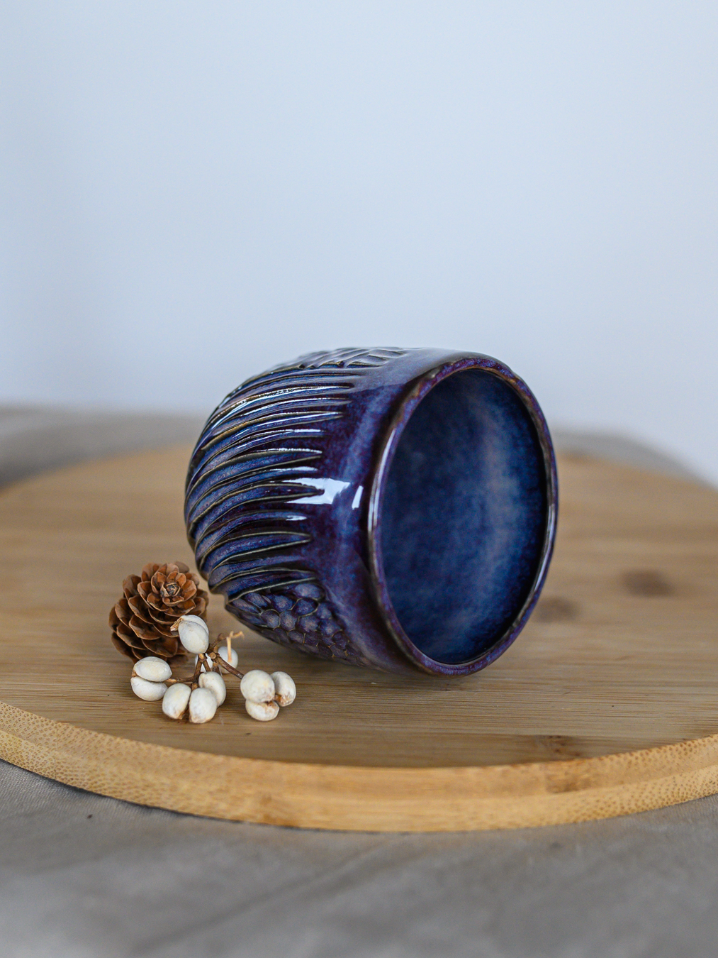 Czarka ze wzorem jodełki w odcieniach fioletu, uformowana na kole garncarskim z jasnej gliny.