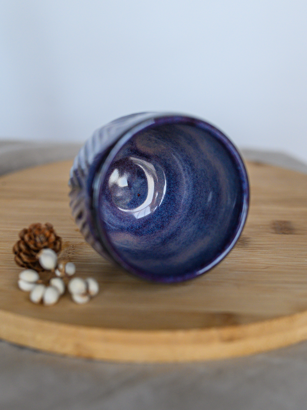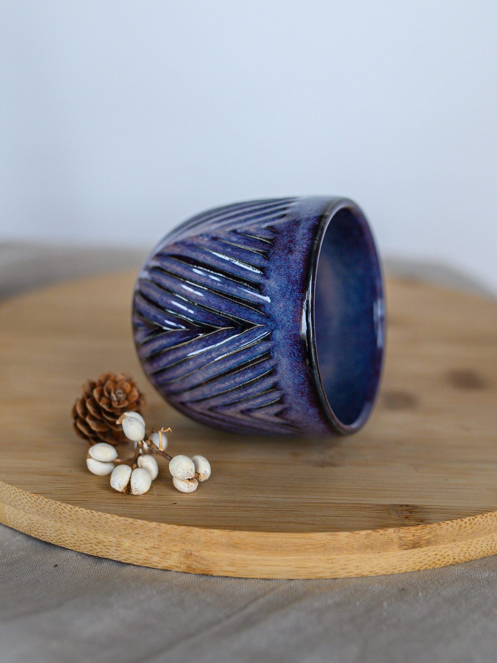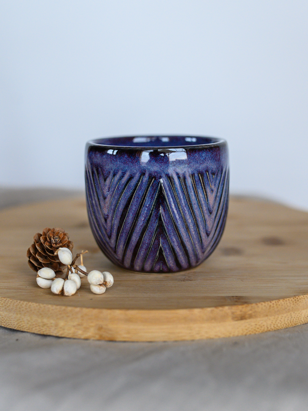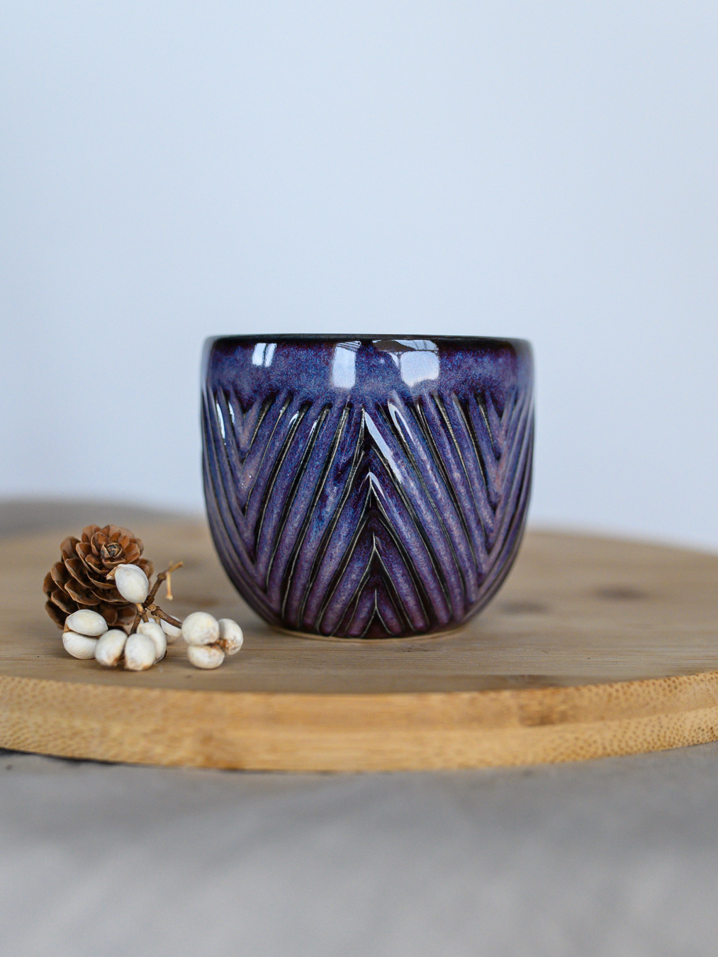 Czarka ze wzorem jodełki w odcieniach fioletu, uformowana na kole garncarskim z jasnej gliny.