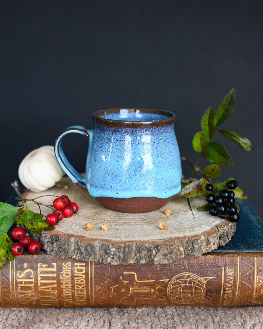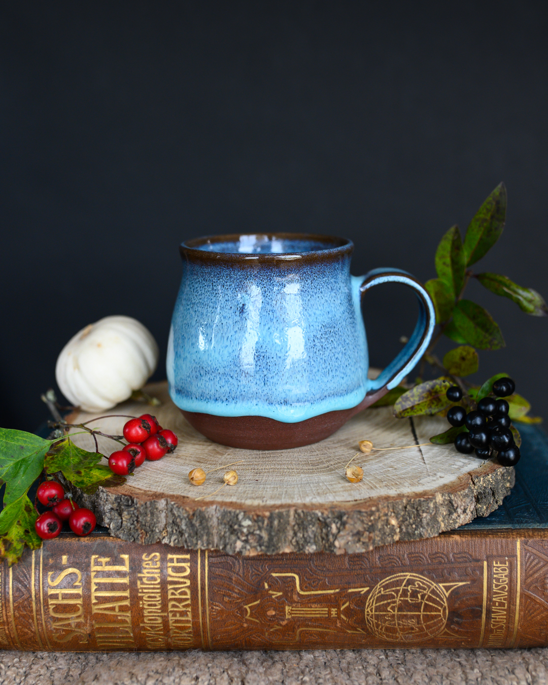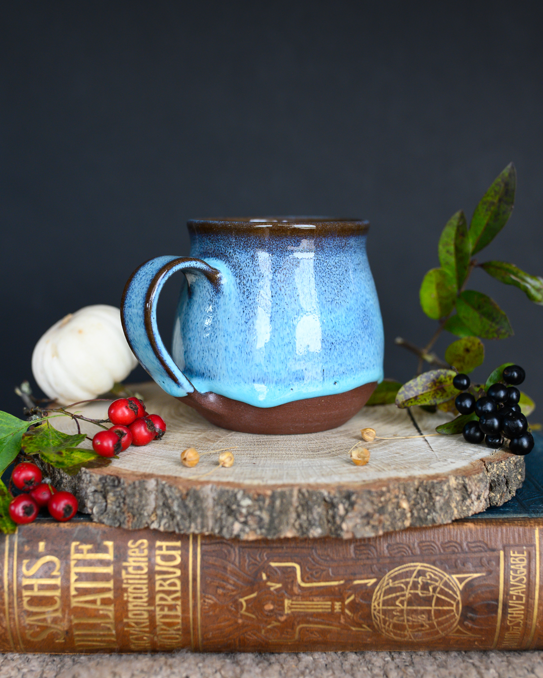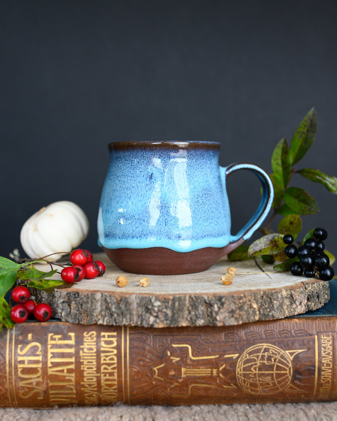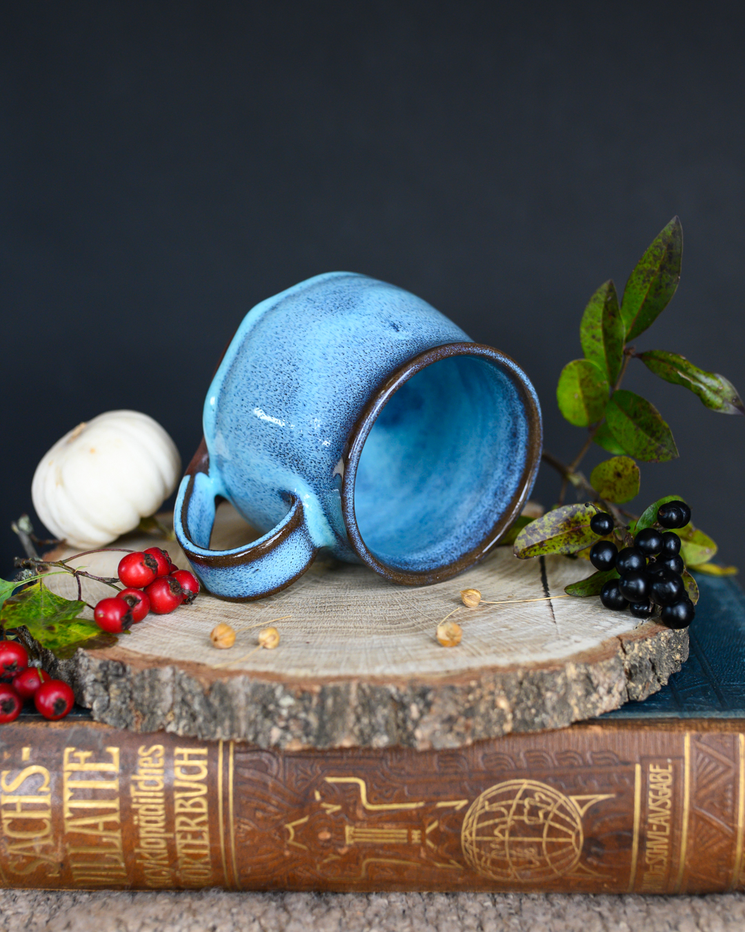 Kubek w kształcie beczułki w kolorze niebieskim, uformowany na kole garncarskim z czerwonej gliny.