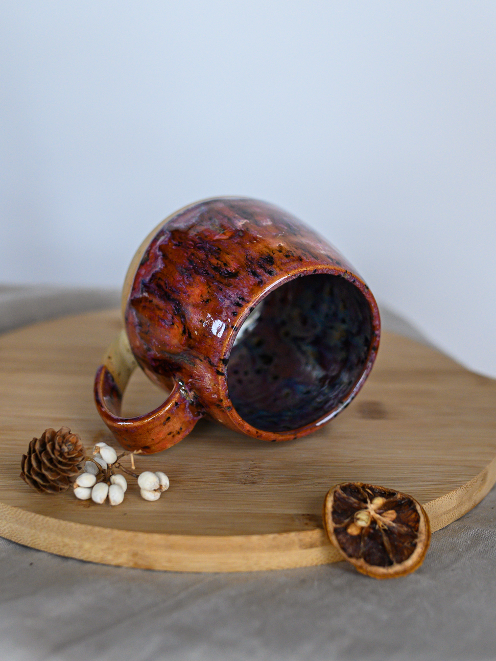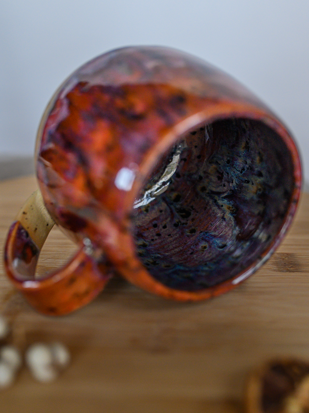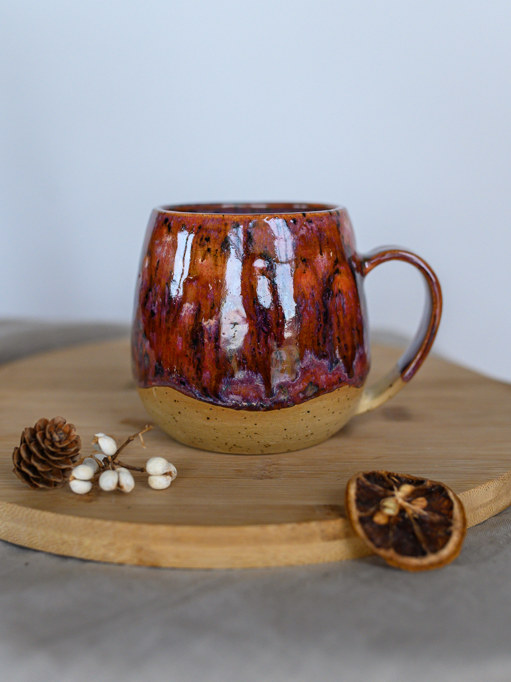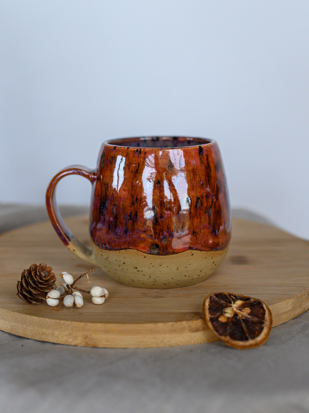 Kubek w odcieniach czerwieni, różu i fioletu, uformowany na kole garncarskim z jasnej gliny w kropki.