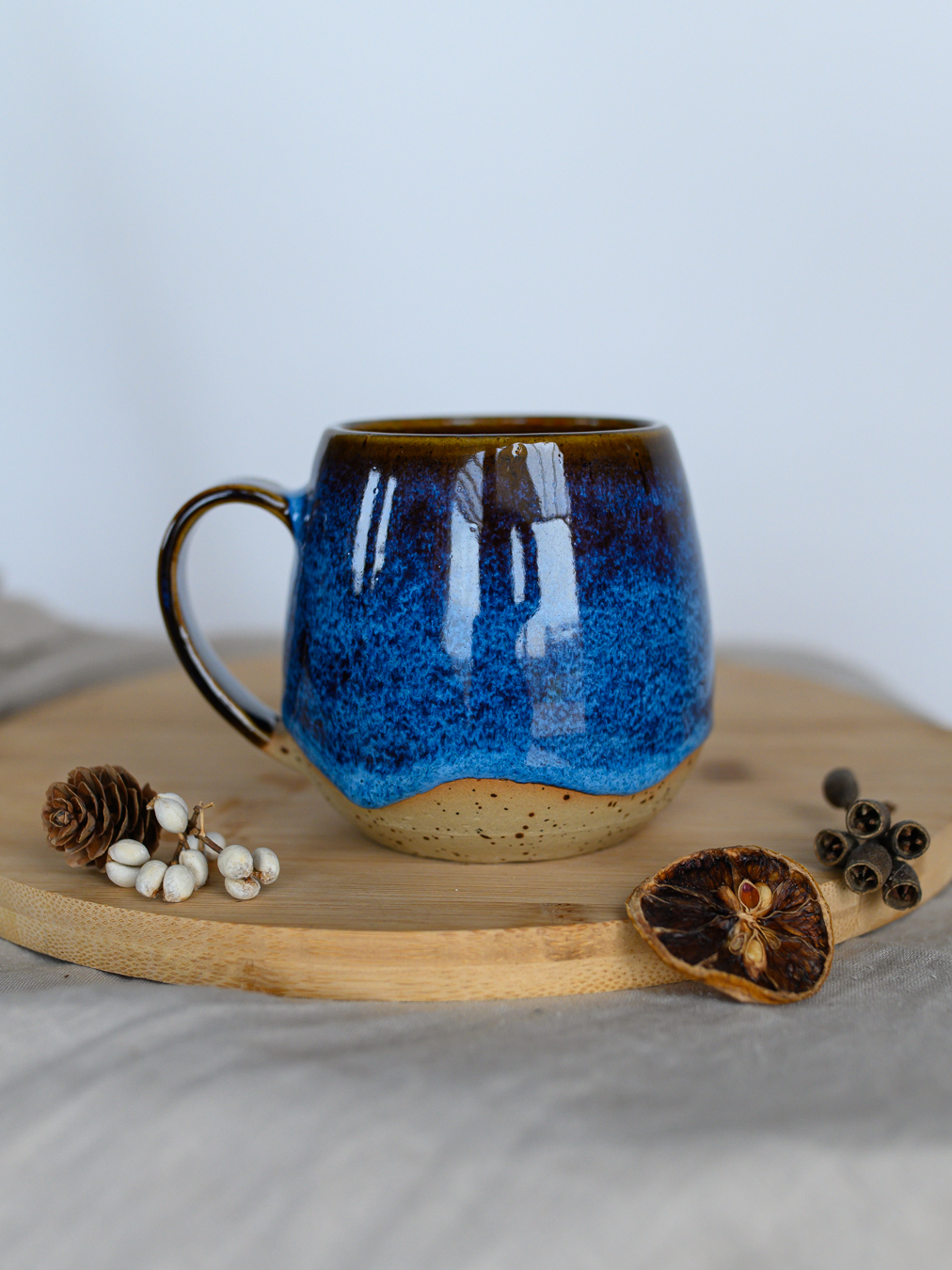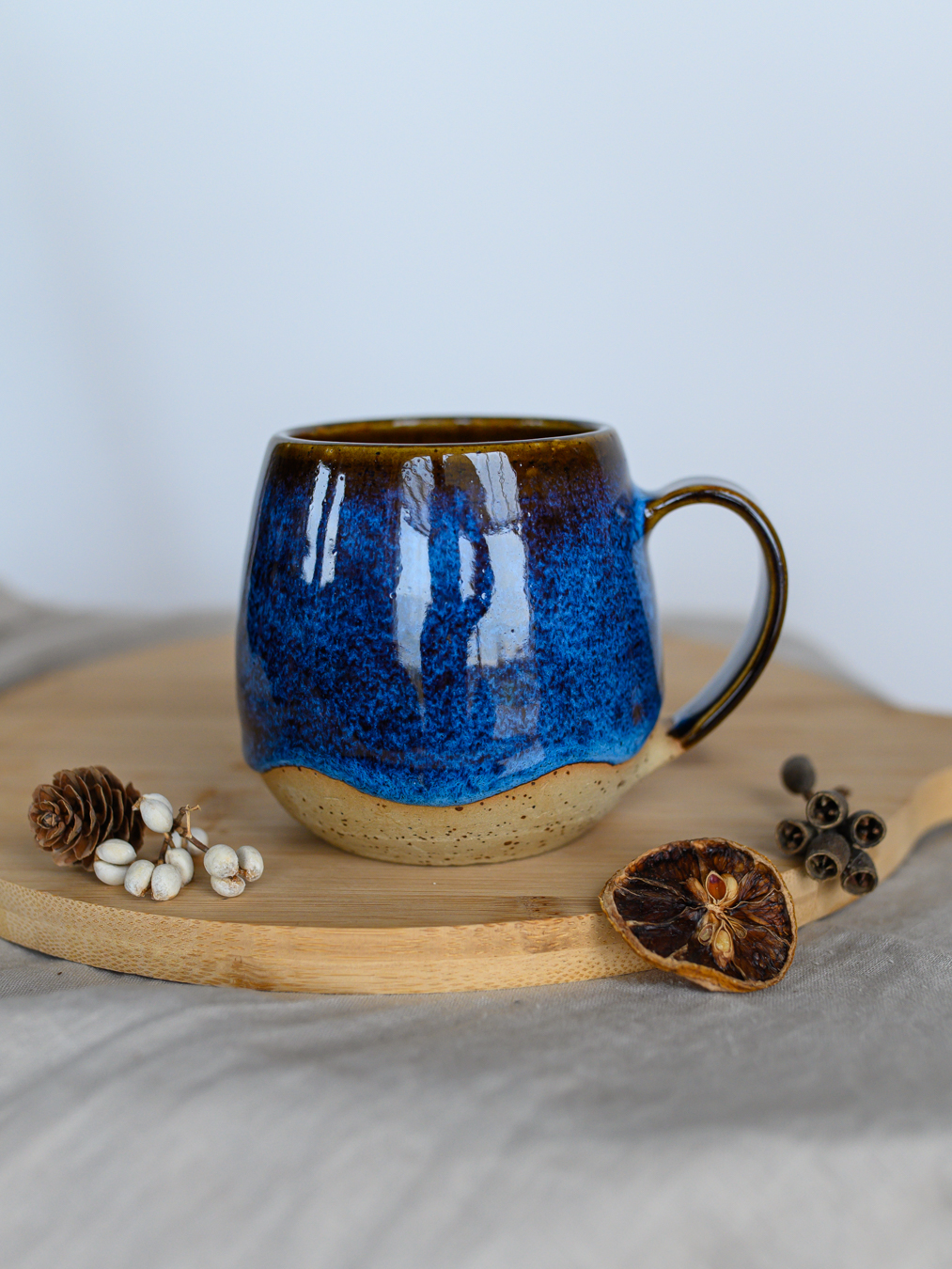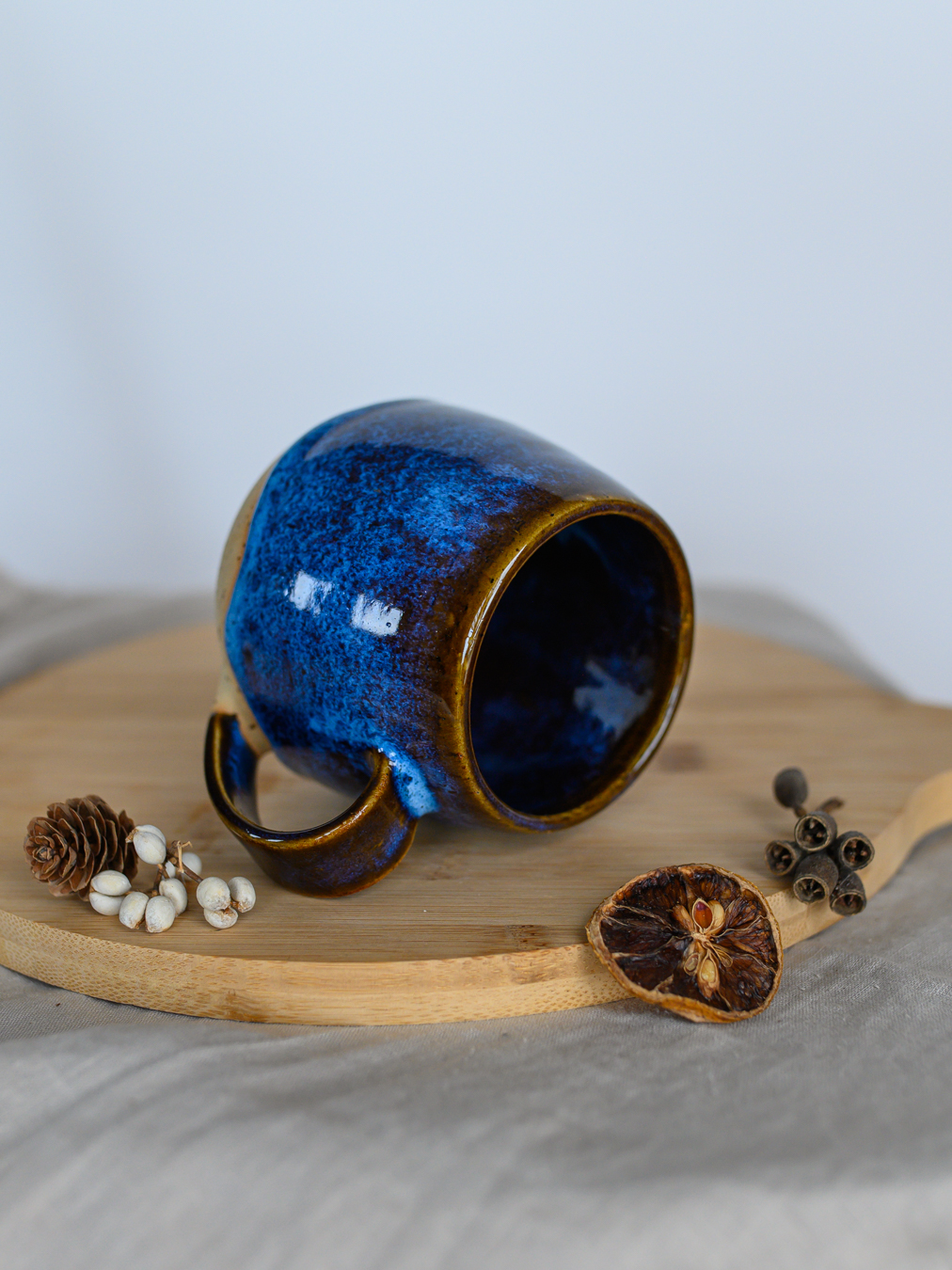 Kubek w odcieniach niebieskiego i brązu, uformowany na kole garncarskim z jasnej gliny w kropki.