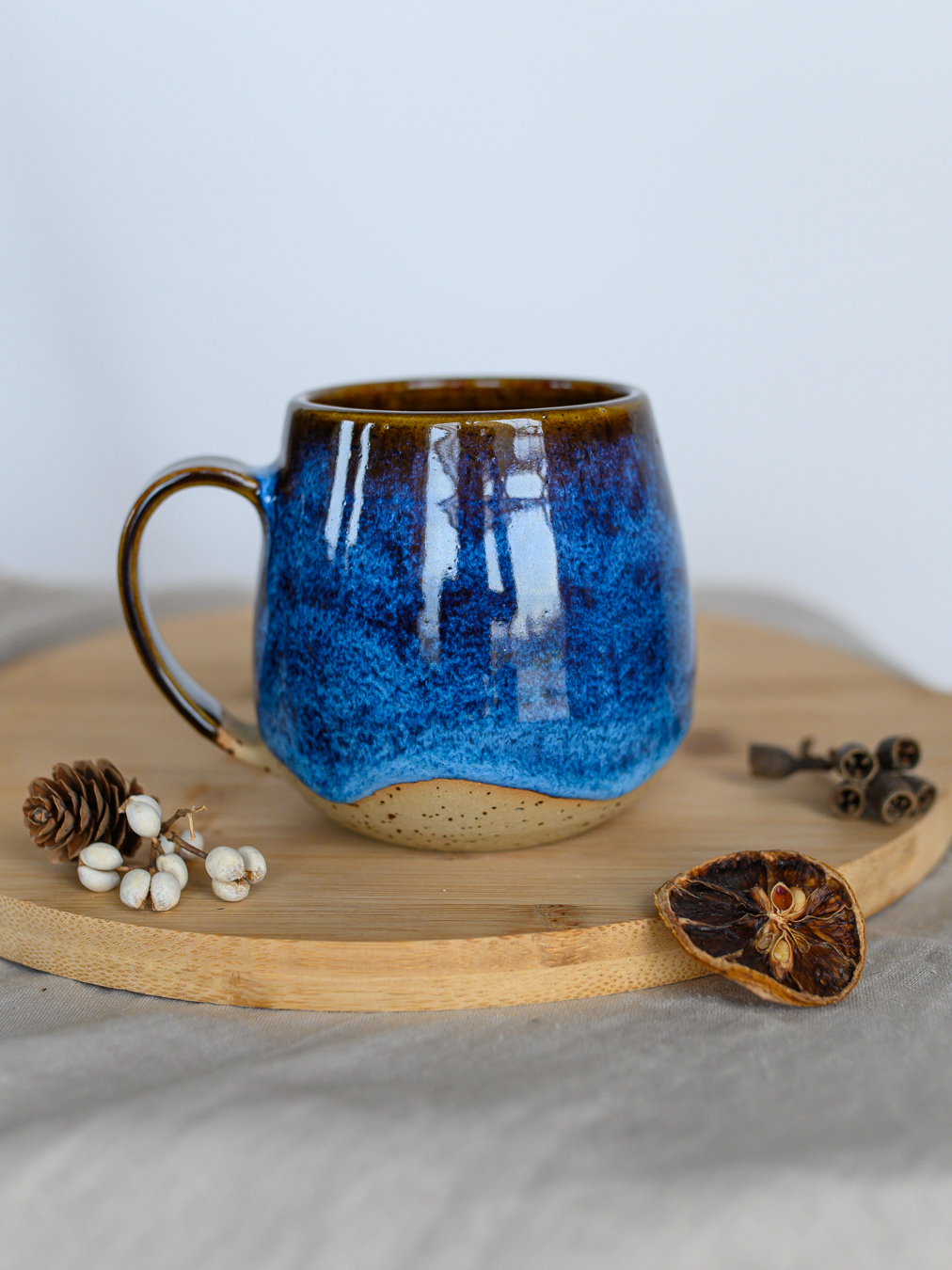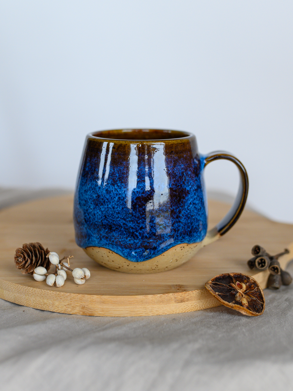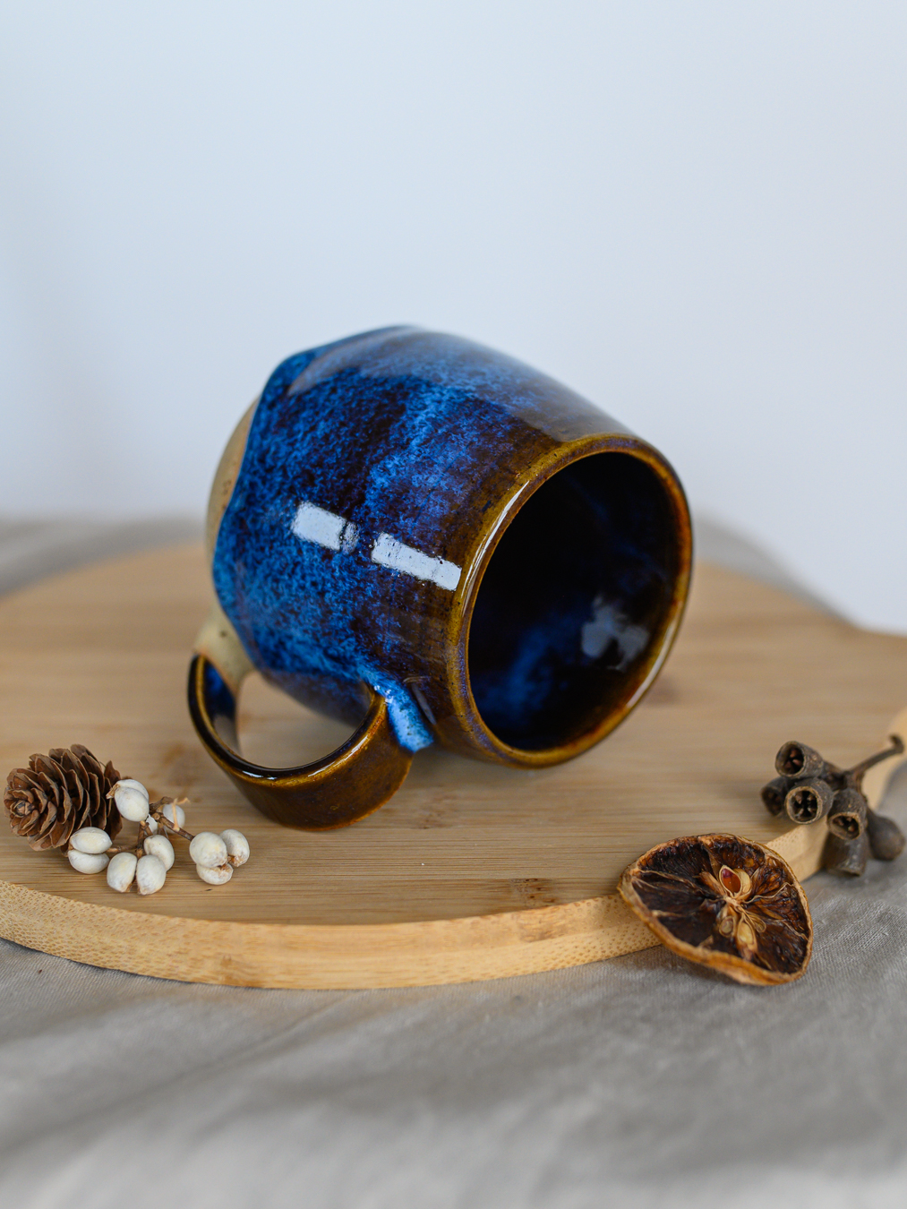 Kubek w odcieniach niebieskiego i brązu, uformowany na kole garncarskim z jasnej gliny w kropki.