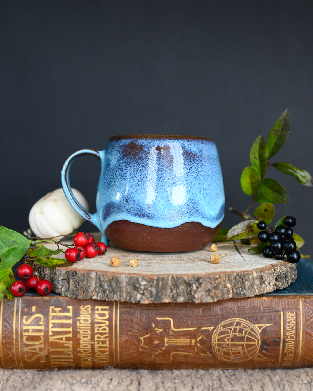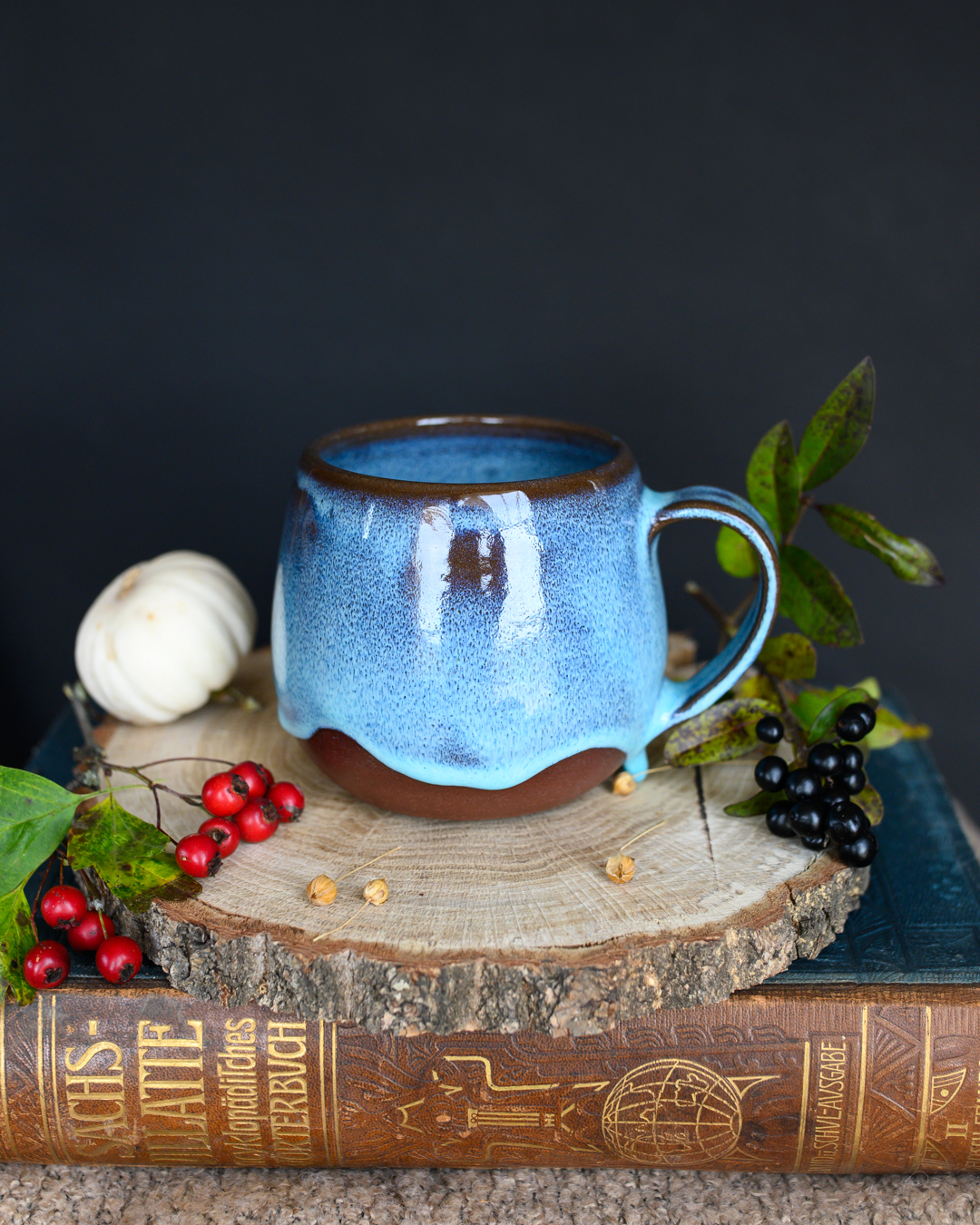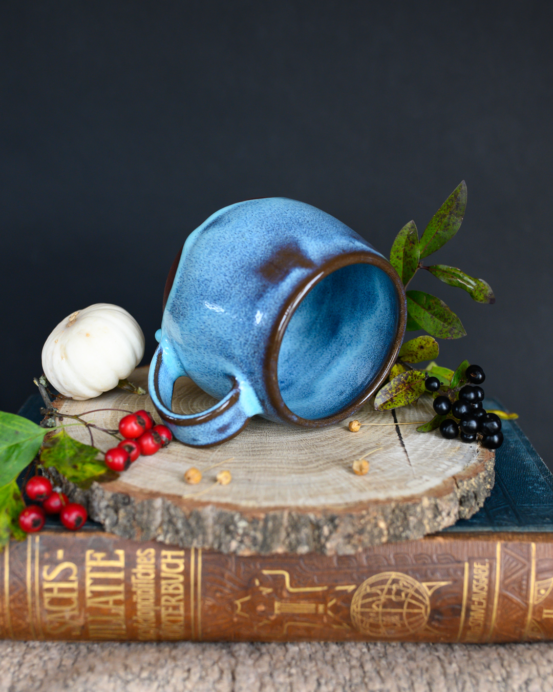 Kubek w kształcie beczułki w kolorze niebieskim, uformowany na kole garncarskim z czerwonej gliny.