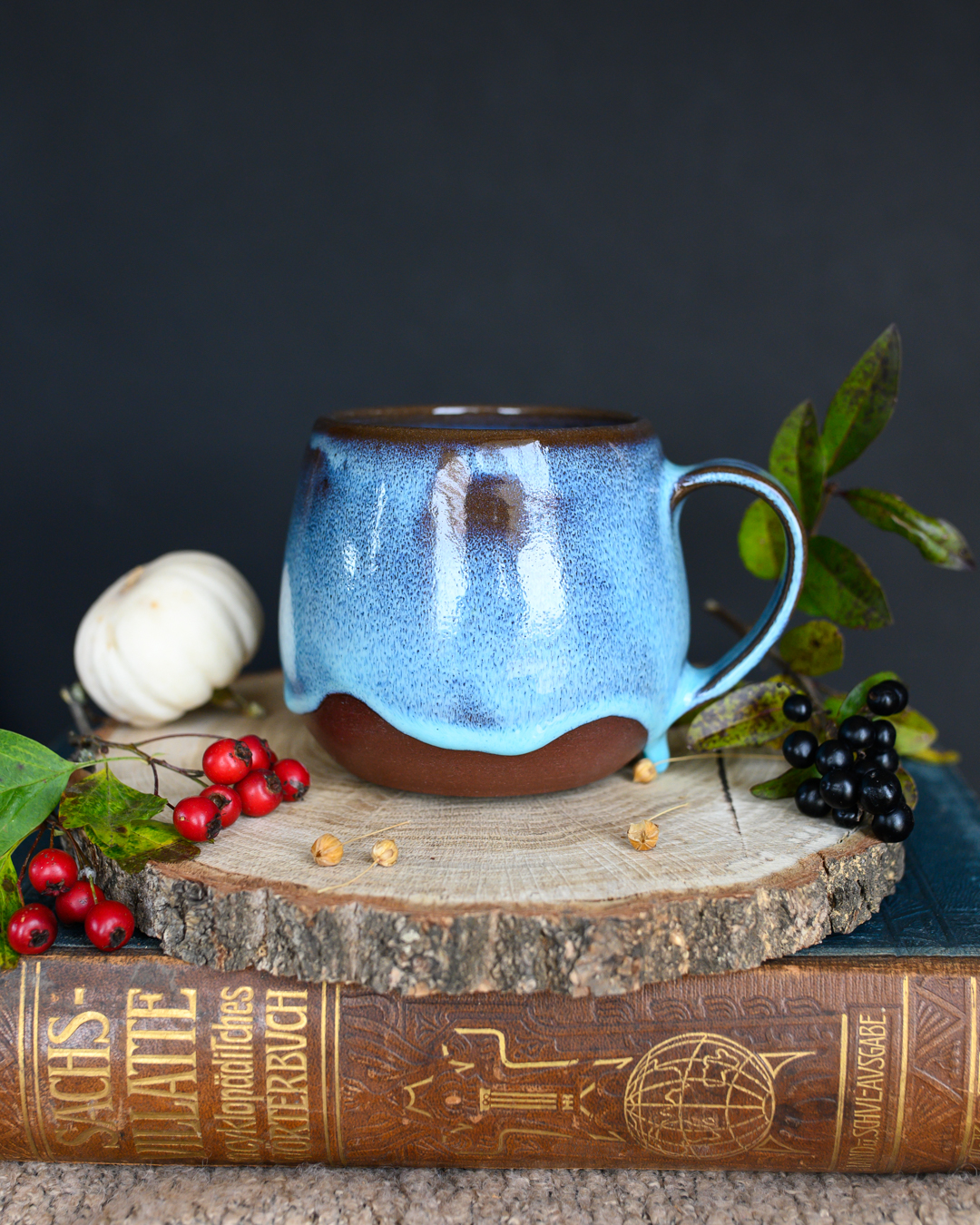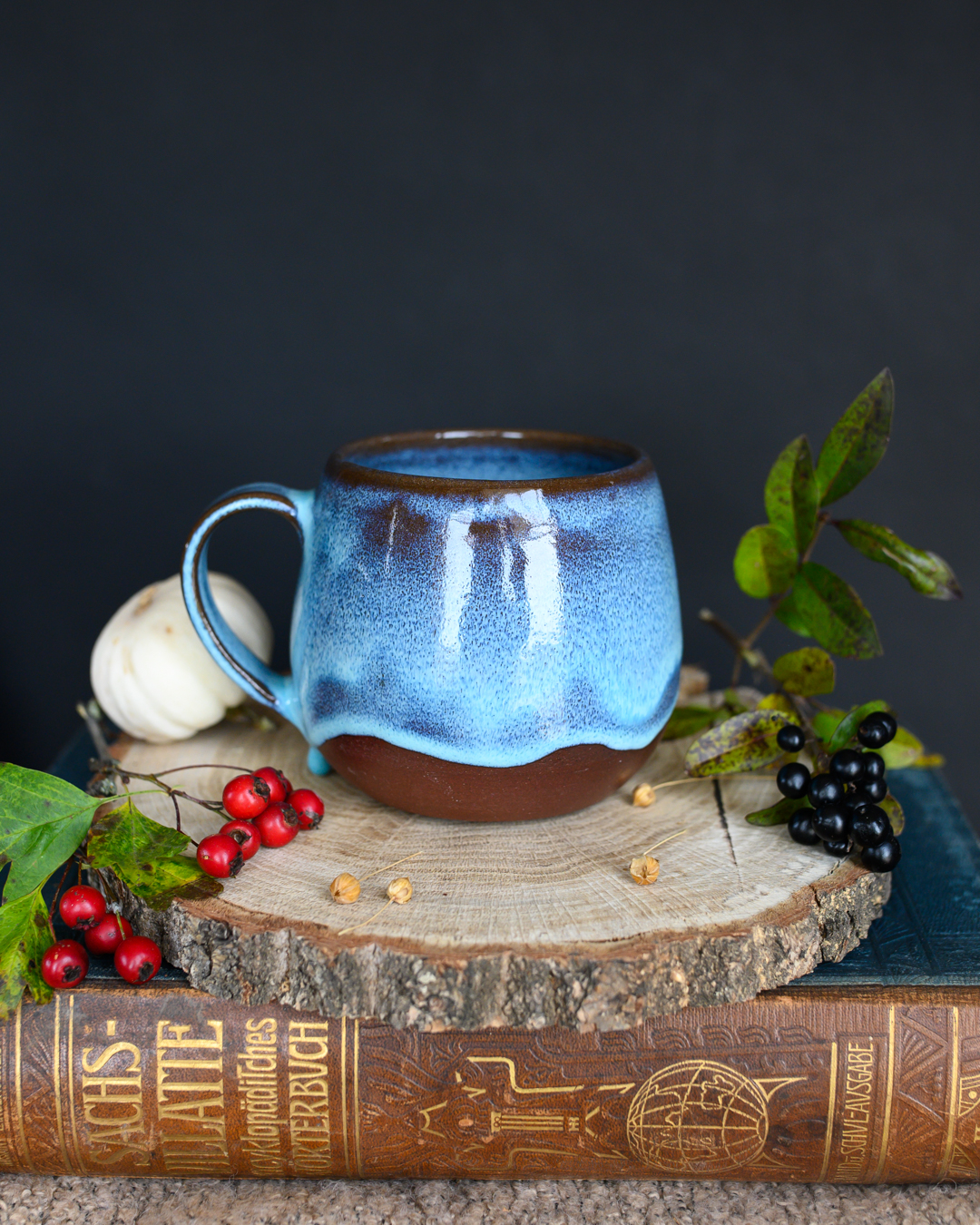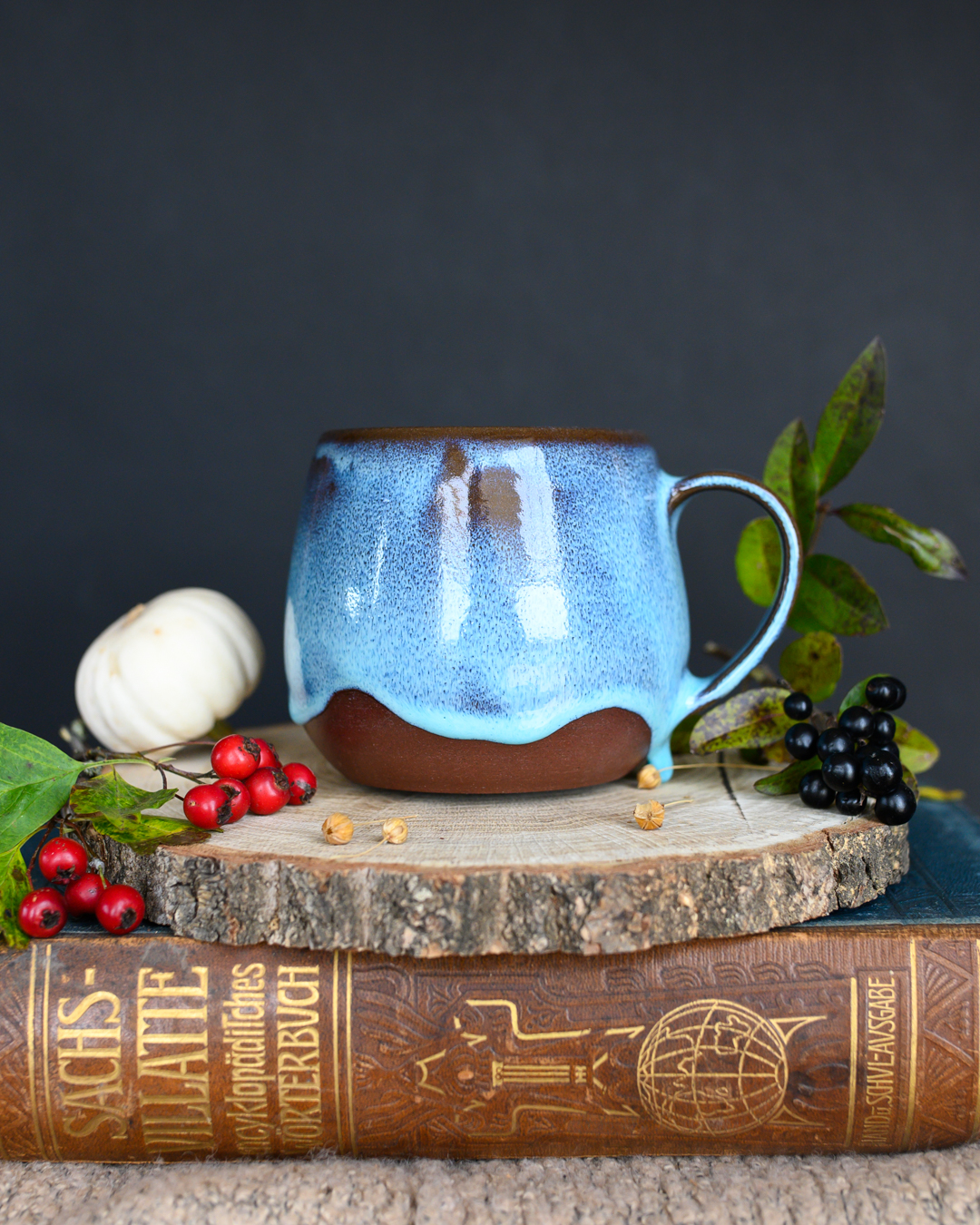 Kubek w kształcie beczułki w kolorze niebieskim, uformowany na kole garncarskim z czerwonej gliny.