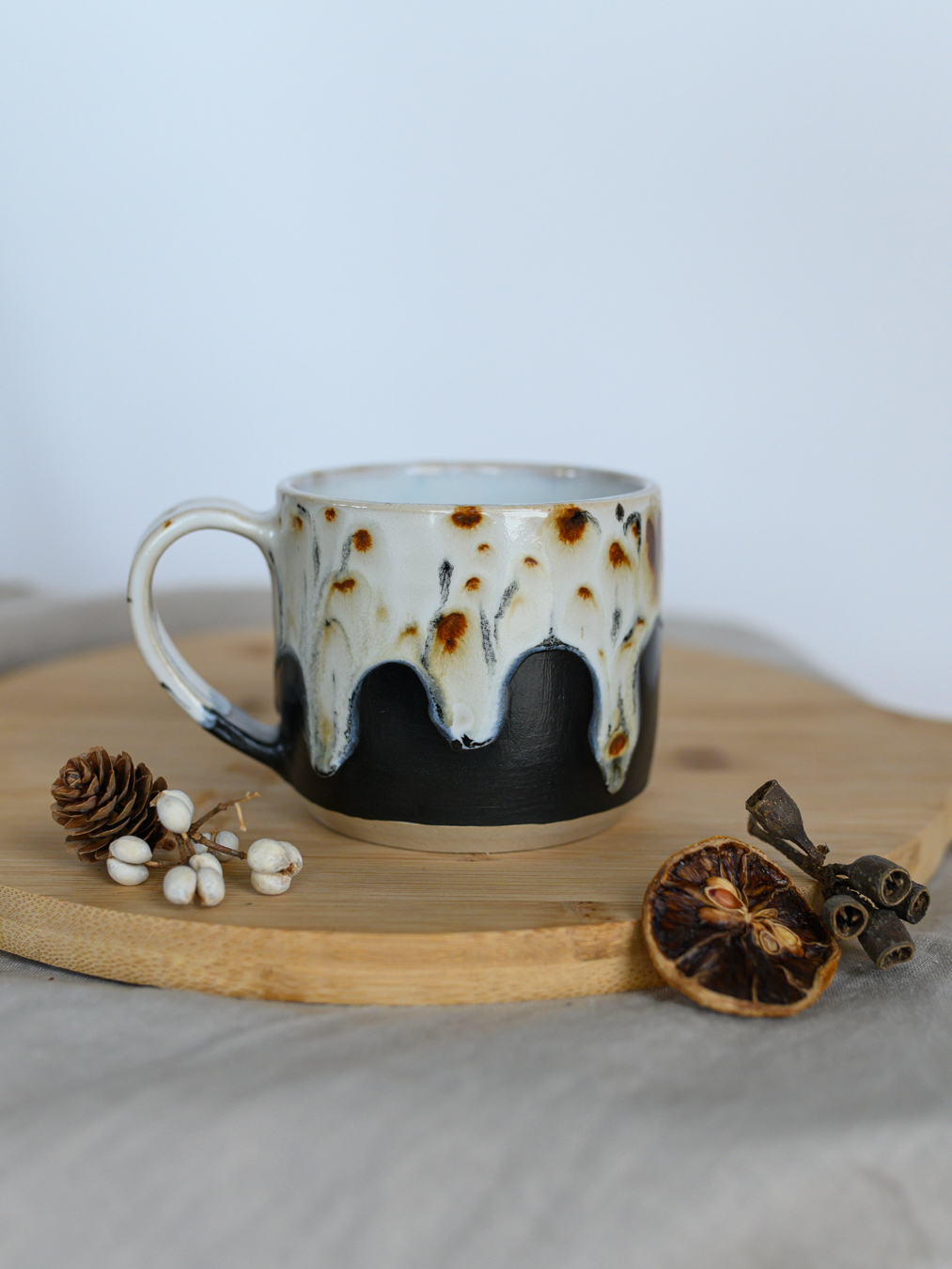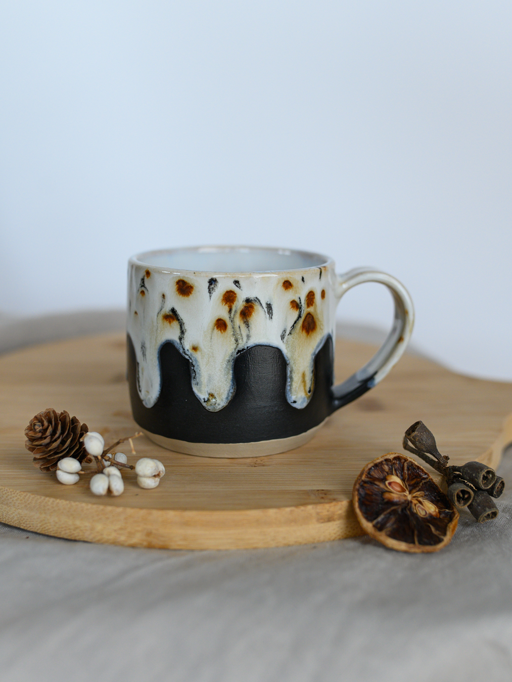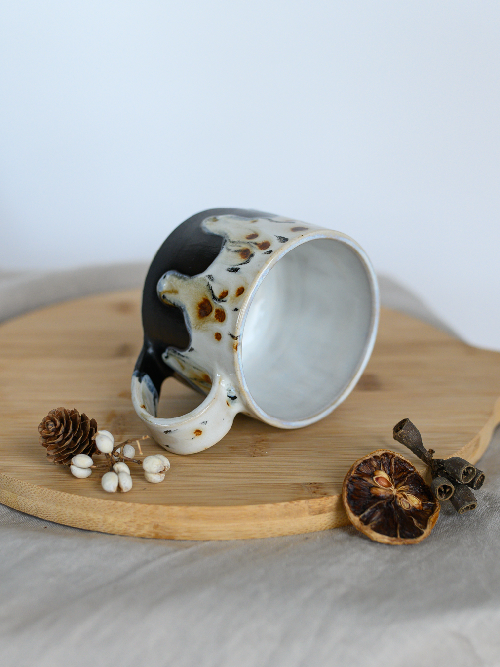 Kubek pokryty w górnej części jasnym szkliwem z deseniem przypominającym cętki. Dół kubka jest w kolorze czarnym, matowym. Uformowany na kole garncarskim z jasnej gliny.