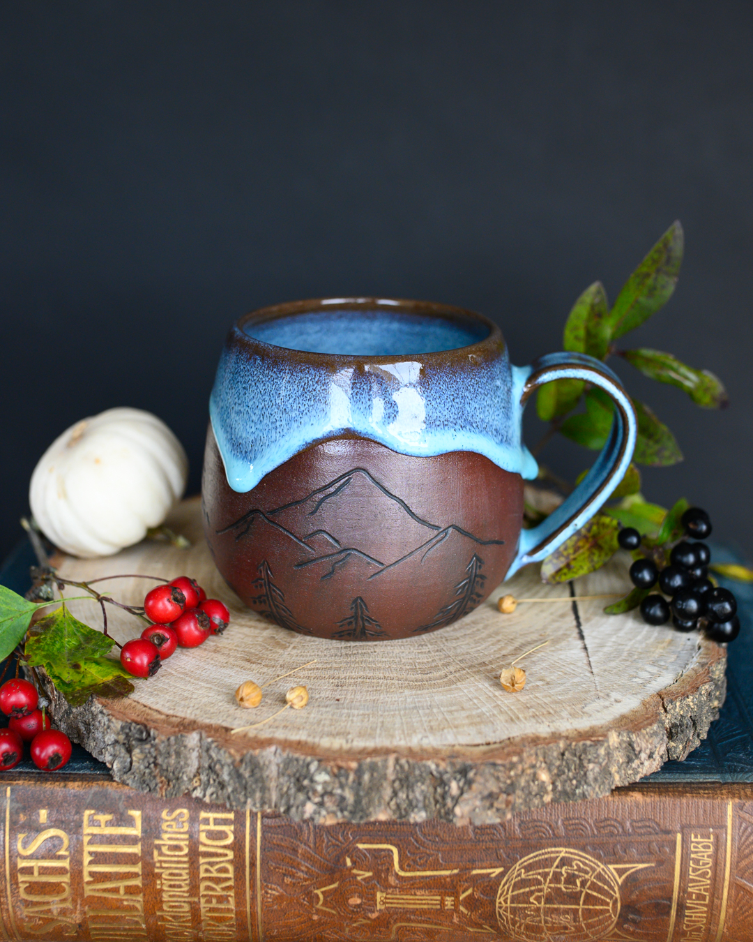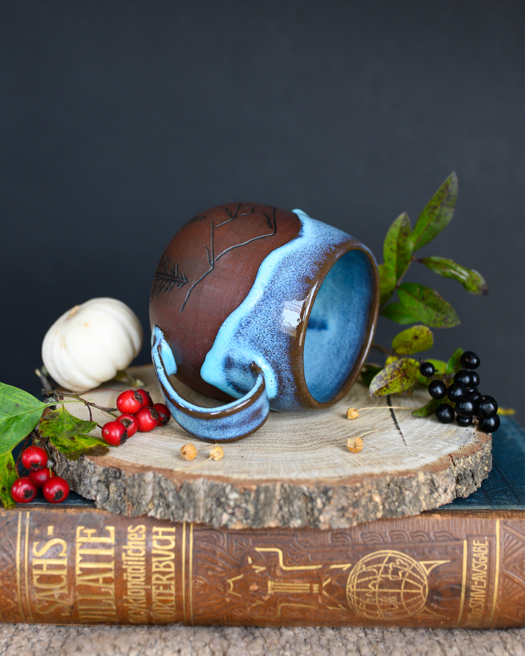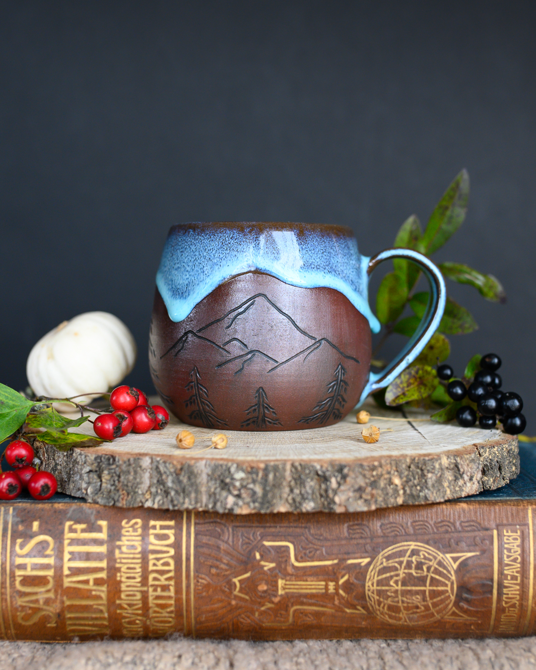 Kubek w kolorze niebieskim, ozdobiony ręcznie wykonanymi rysunkami gór i świerków. Uformowany na kole garncarskim z czerwonej gliny.
