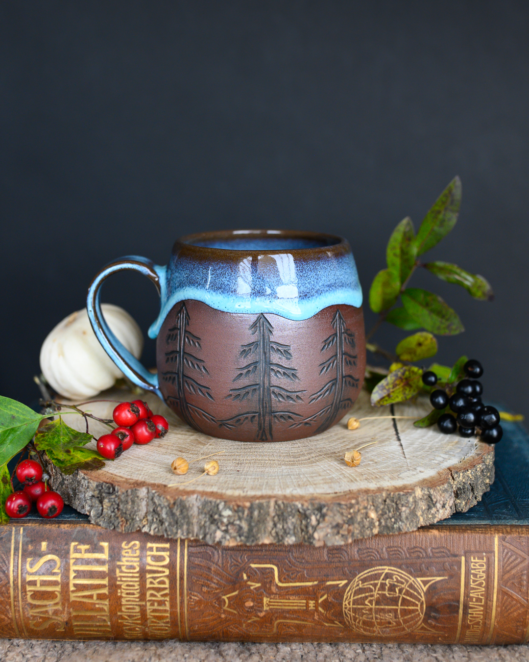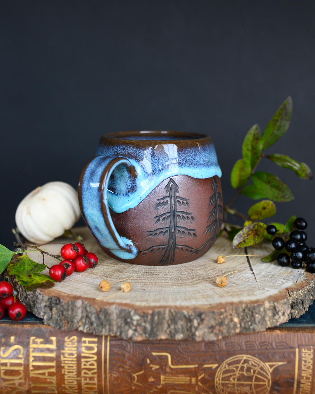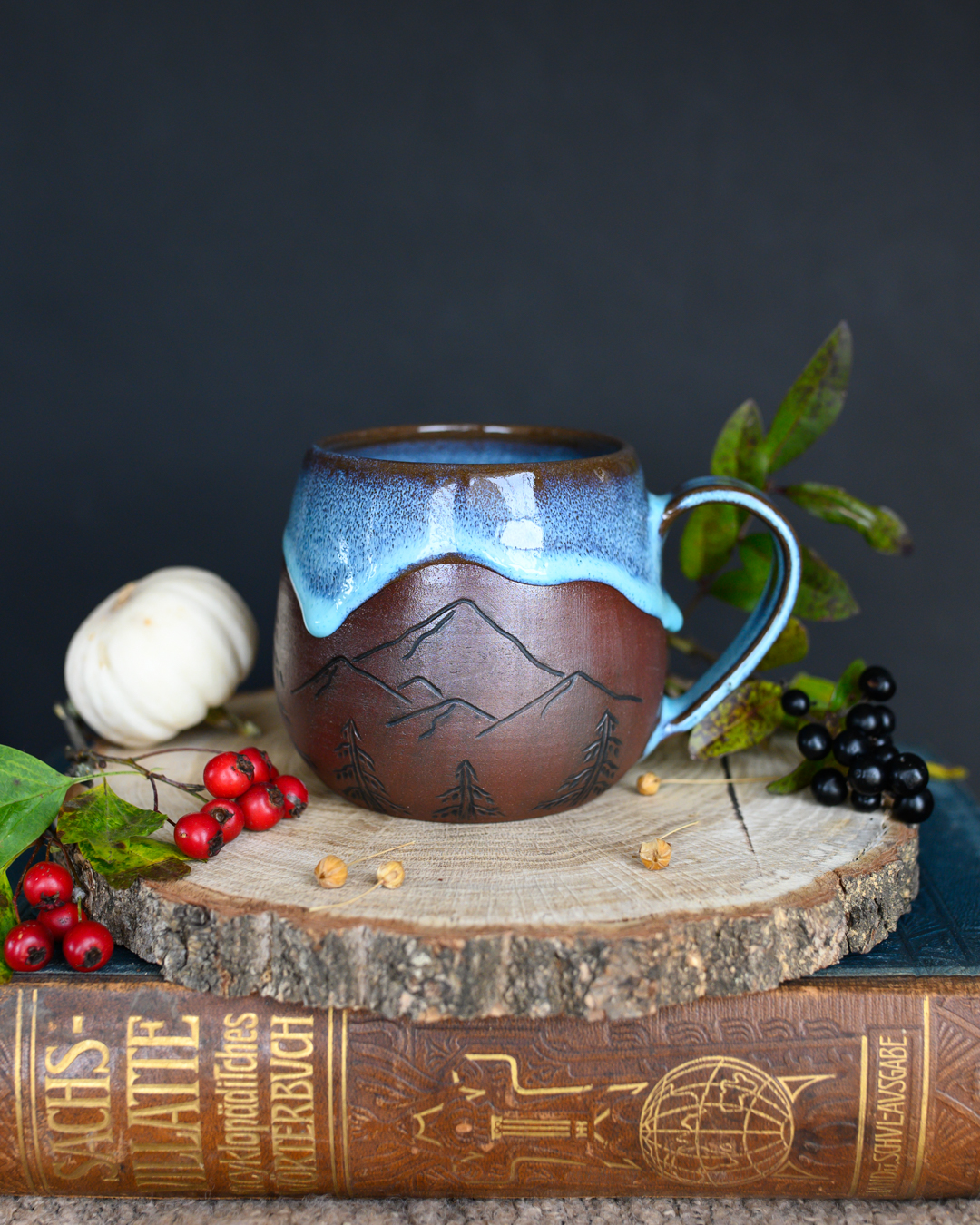 Kubek w kolorze niebieskim, ozdobiony ręcznie wykonanymi rysunkami gór i świerków. Uformowany na kole garncarskim z czerwonej gliny.