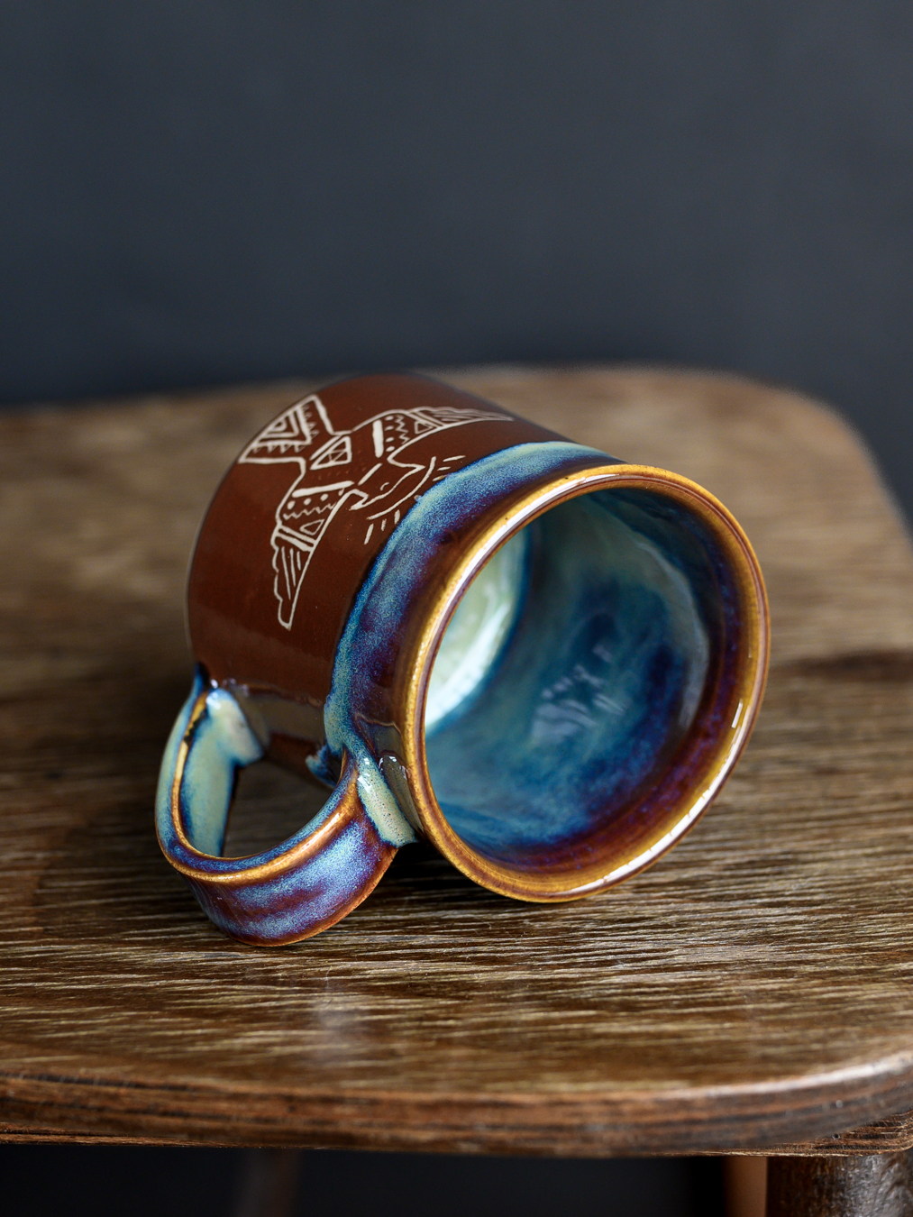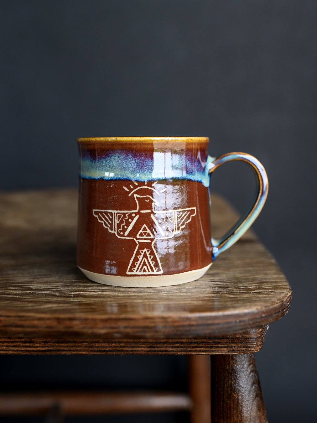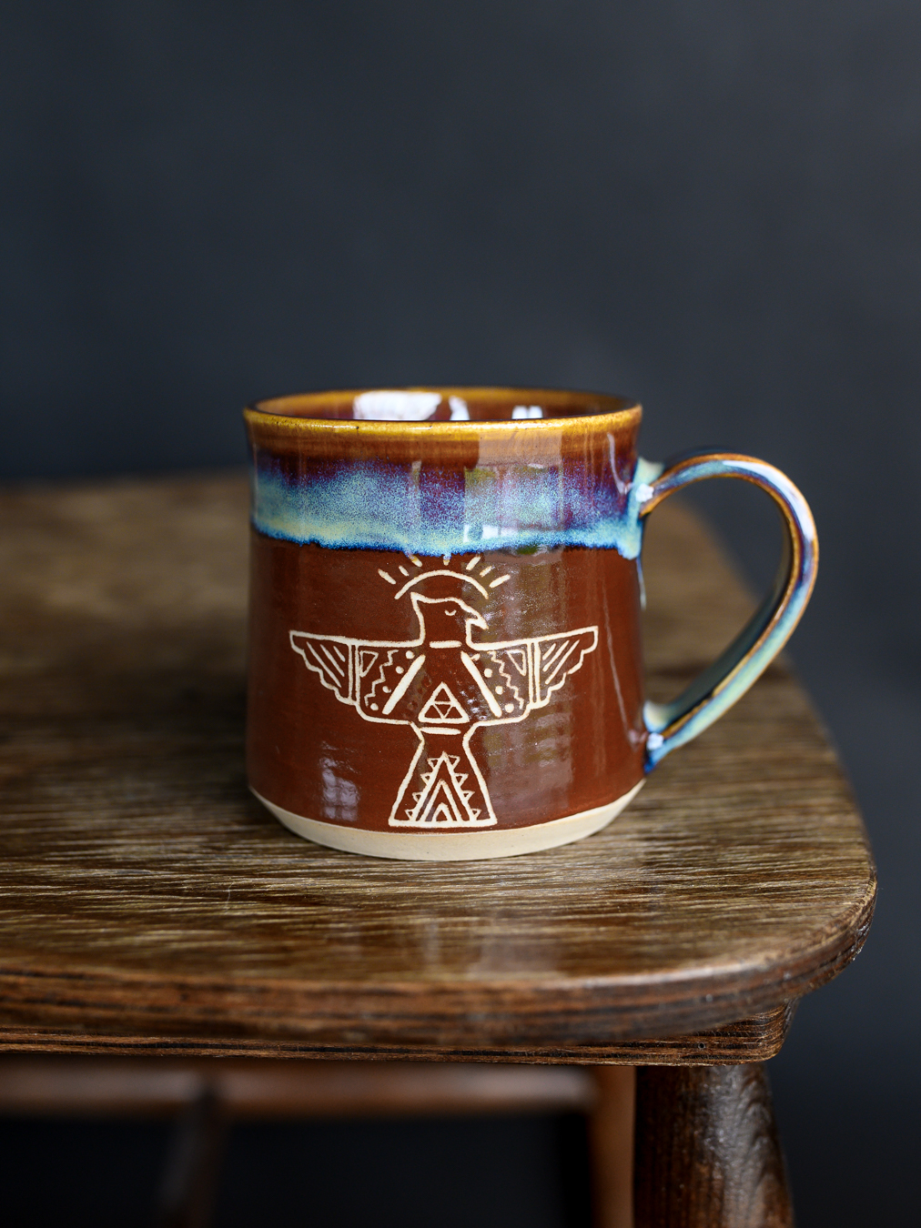 Kubek w odcieniach brązu i niebieskości, ozdobiony ręcznie wykonanymi rysunkami gór i mitologicznego ptaka gromu (thunderbird). Uformowany na kole garncarskim z jasnej gliny.