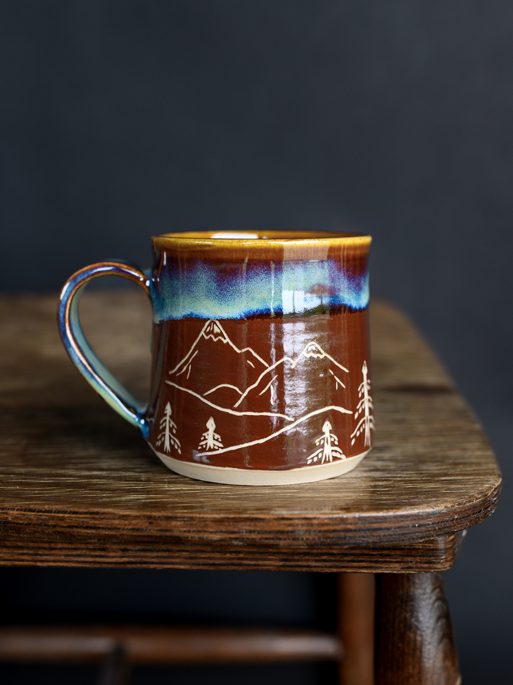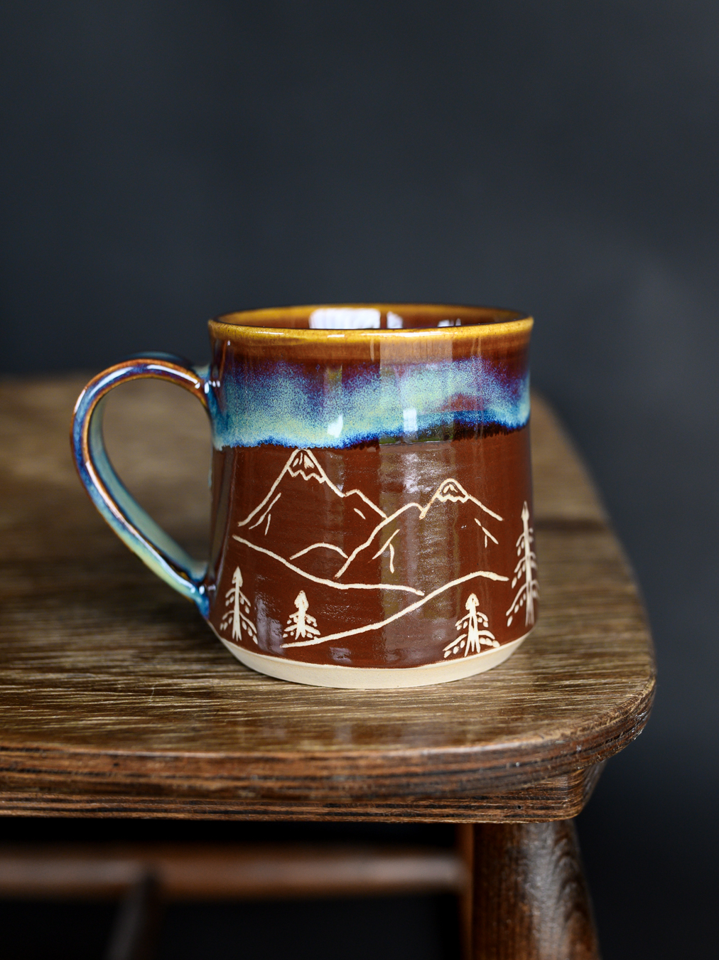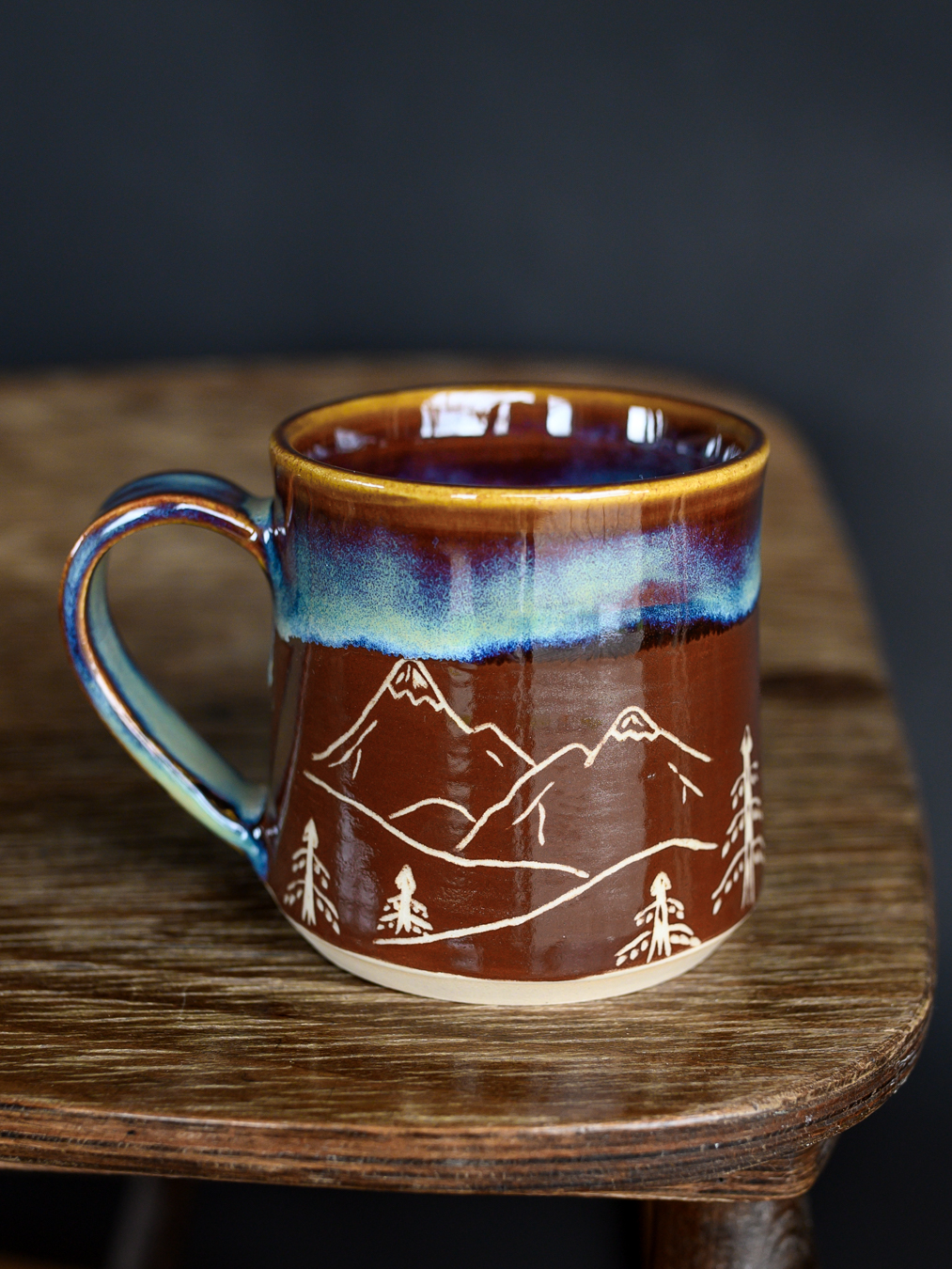 Kubek w odcieniach brązu i niebieskości, ozdobiony ręcznie wykonanymi rysunkami gór i mitologicznego ptaka gromu (thunderbird). Uformowany na kole garncarskim z jasnej gliny.