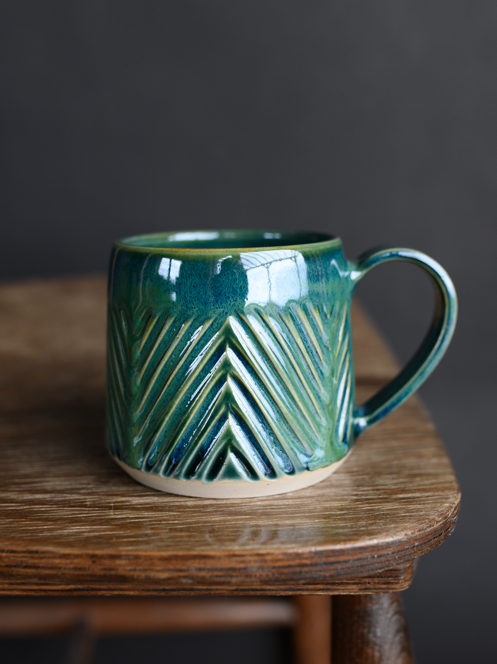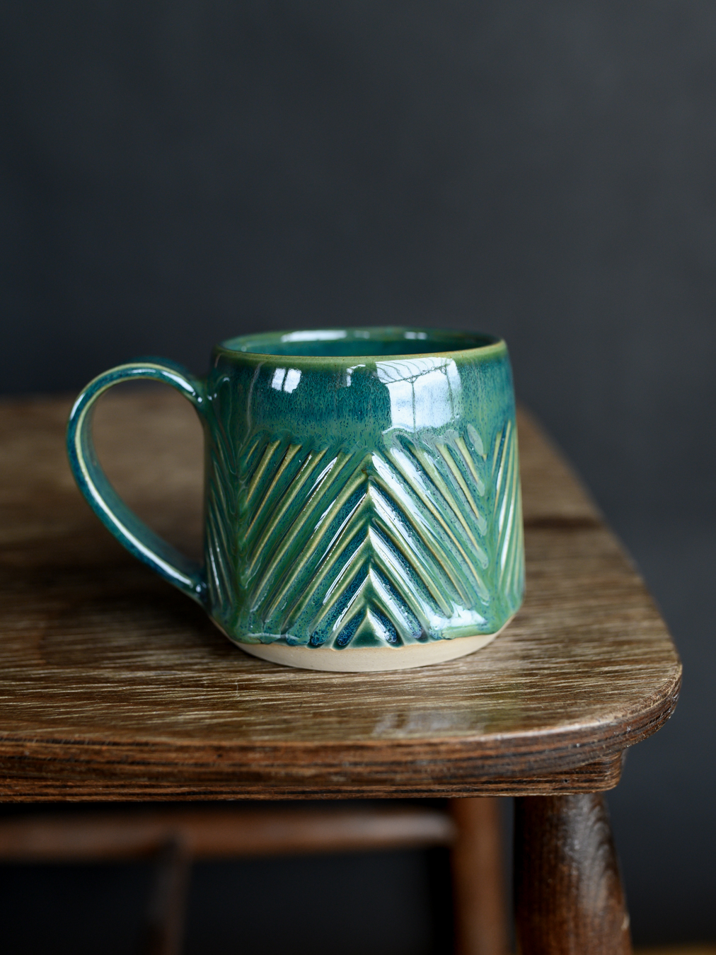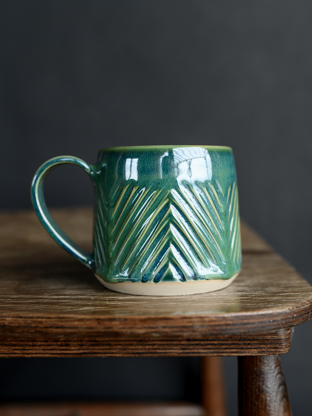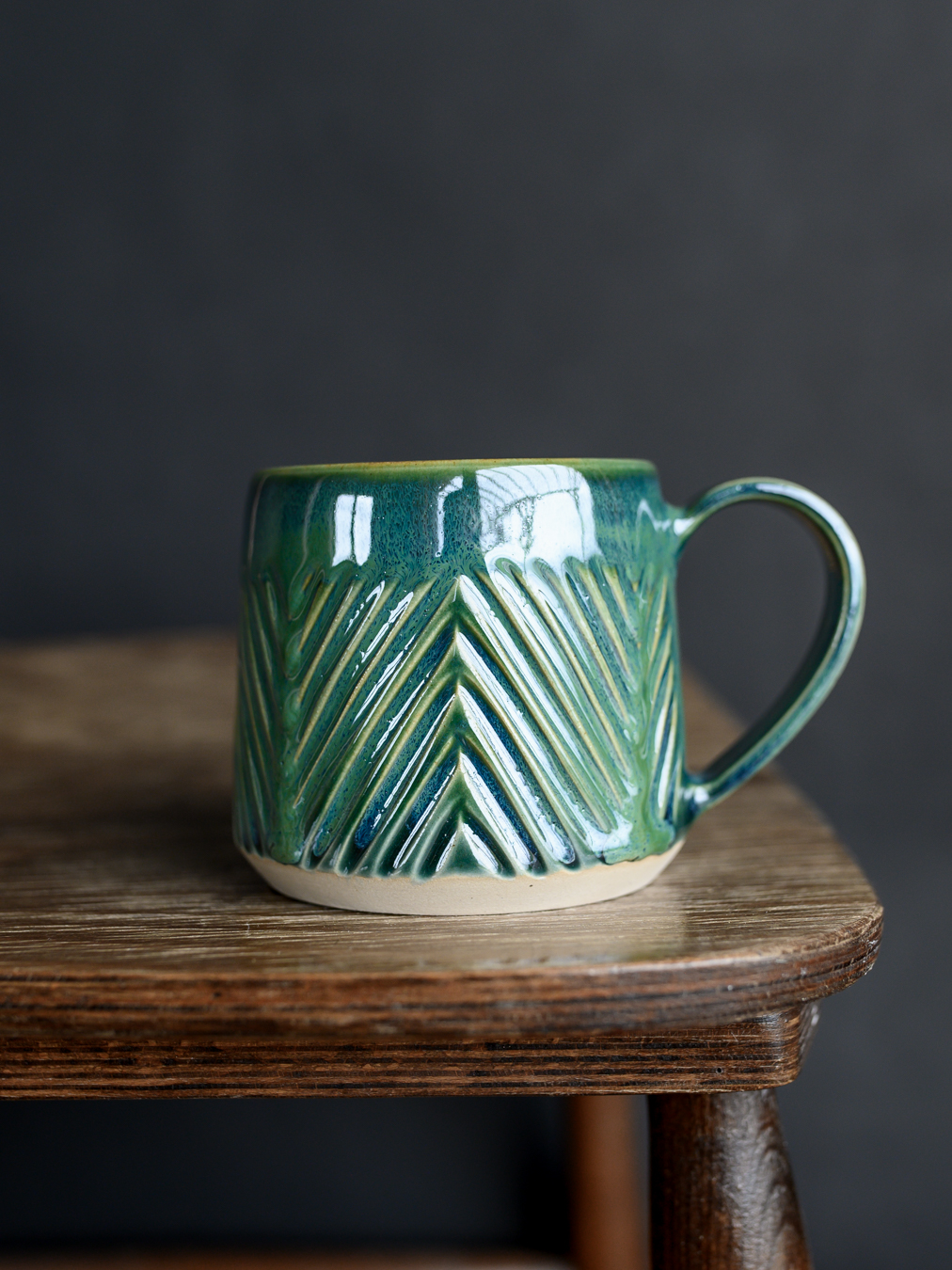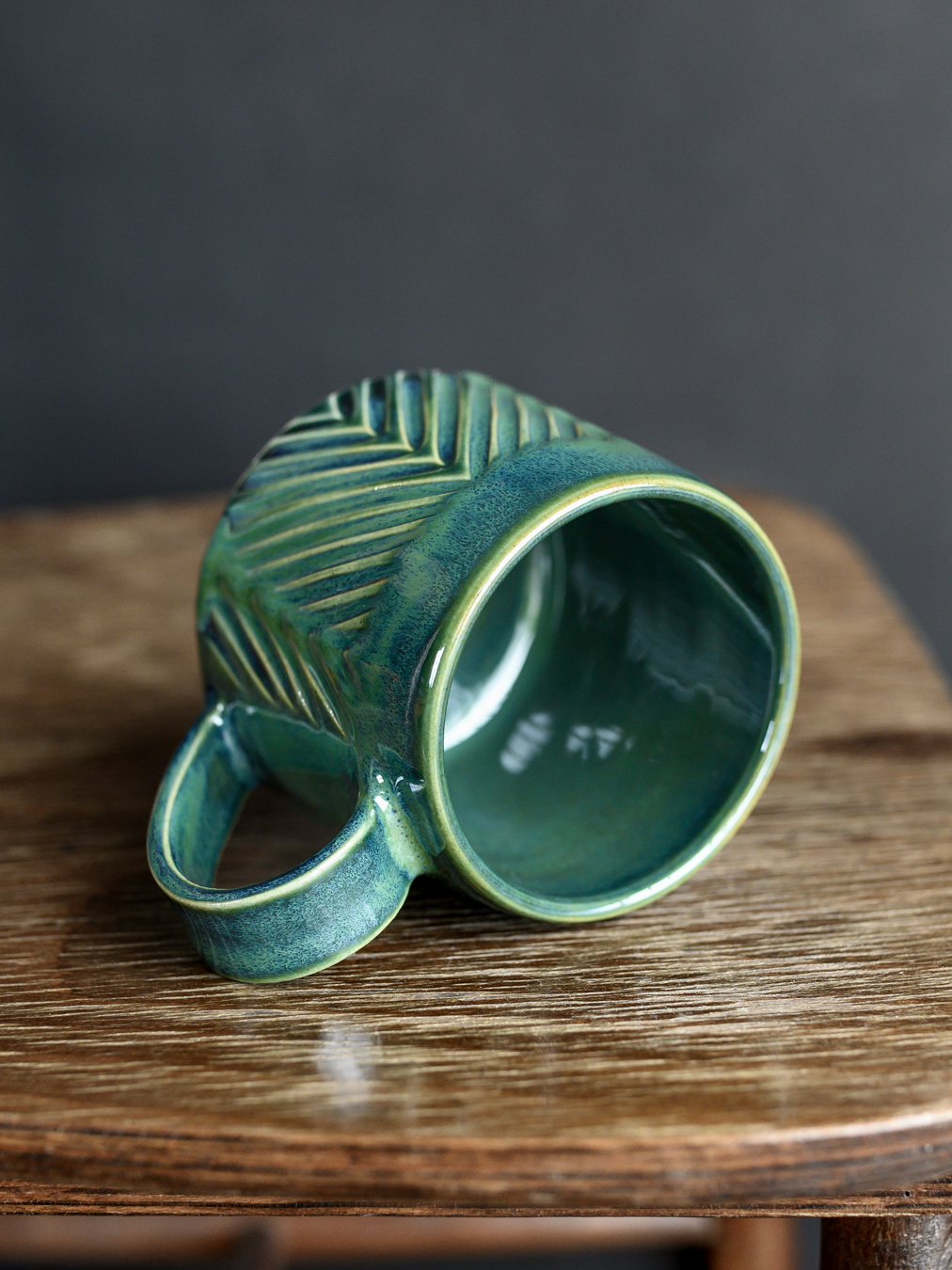 Kubek w odcieniach zieleni z wyżłobieniami układającymi się we wzór jodełki. Wykonany na kole garncarskim z jasnej gliny.