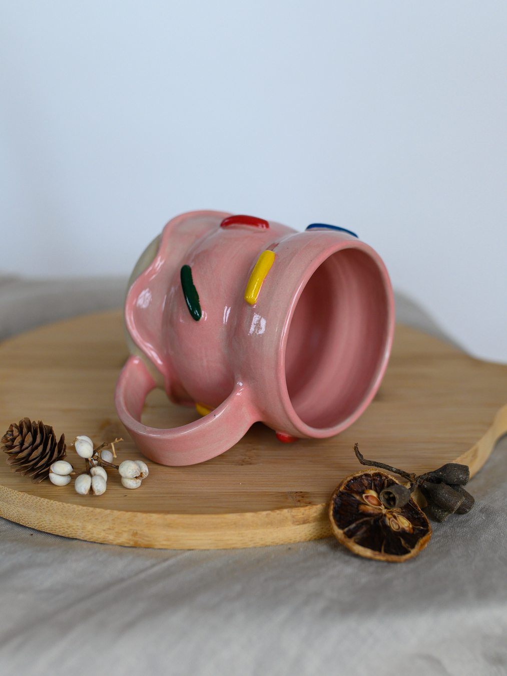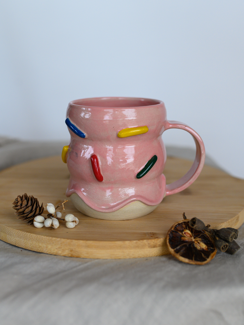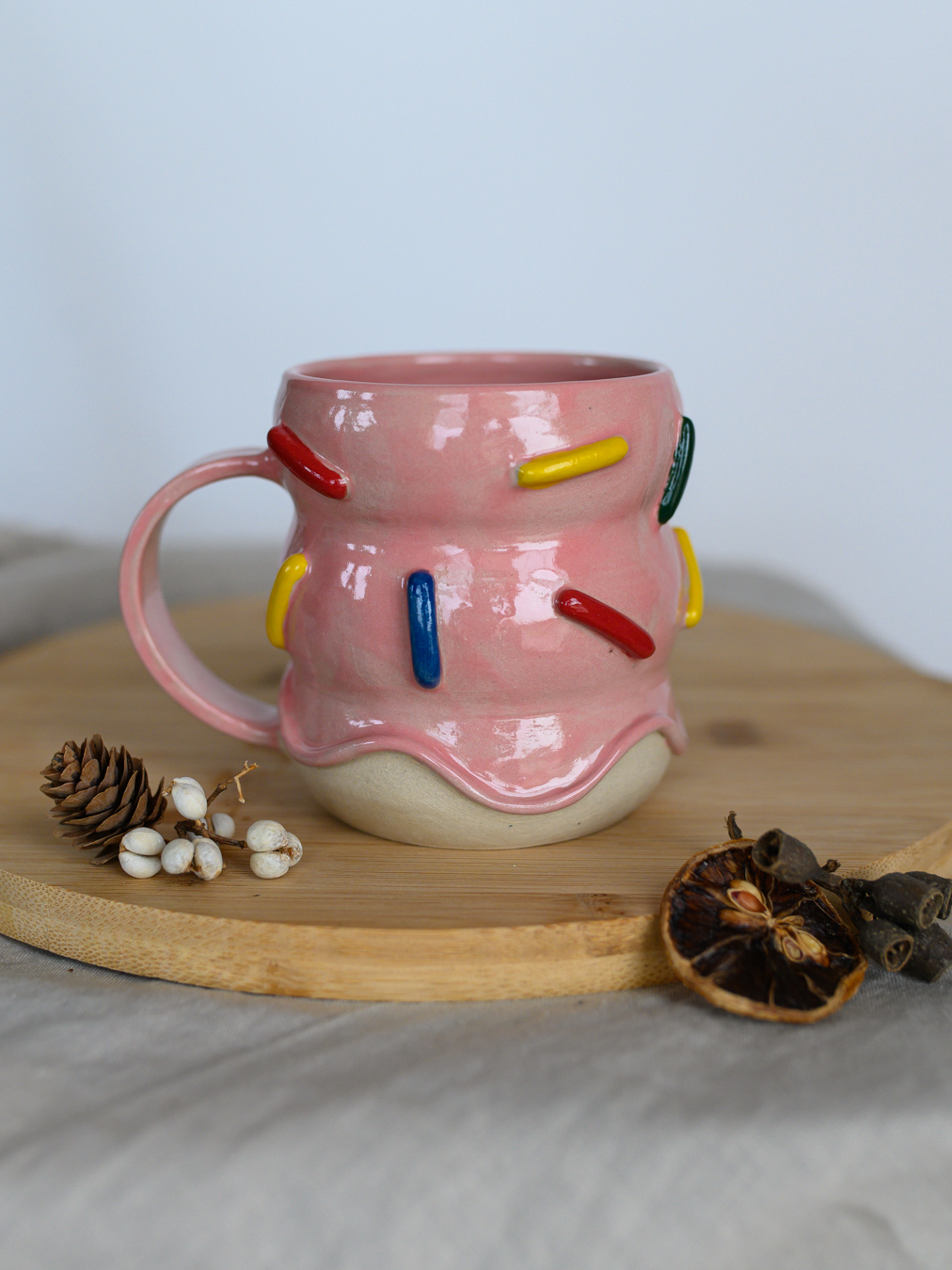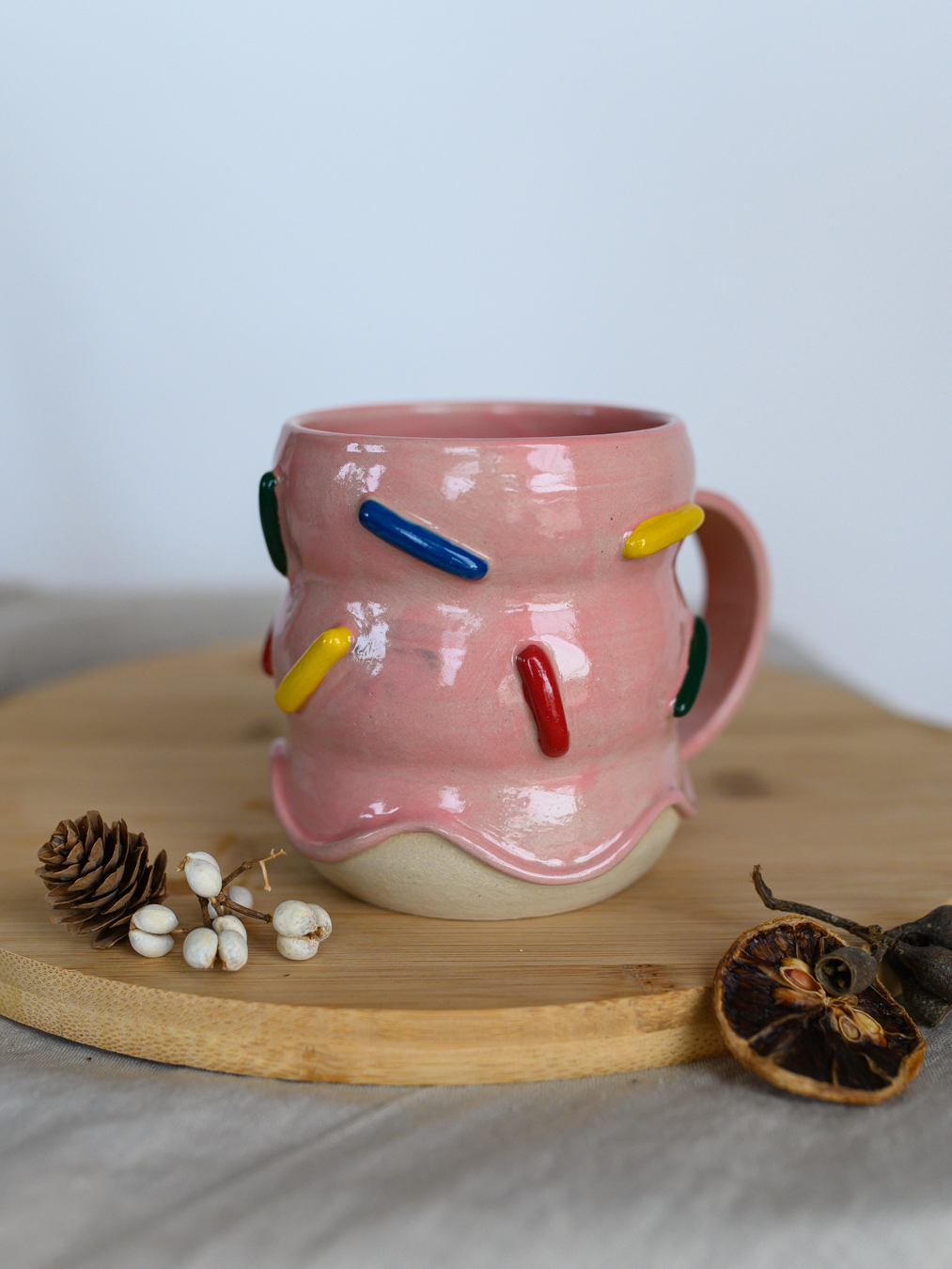 Kubek z brzuszkami pokryty szkliwem w kolorze różowym, przypominającym lukier z kolorową posypką. Uformowany na kole garncarskim z jasnej gliny.