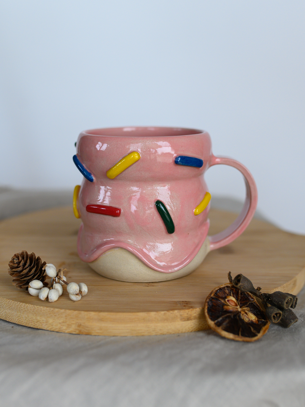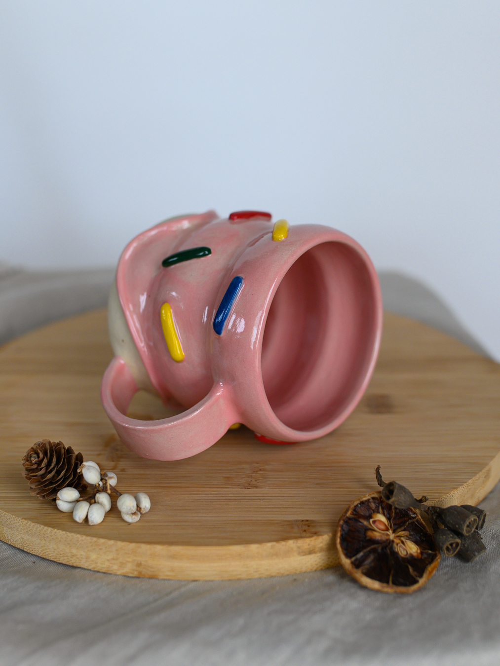 Kubek z brzuszkami pokryty szkliwem w kolorze różowym, przypominającym lukier z kolorową posypką. Uformowany na kole garncarskim z jasnej gliny.