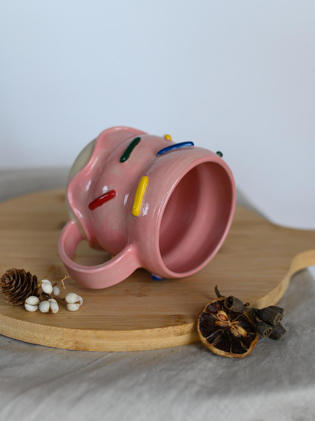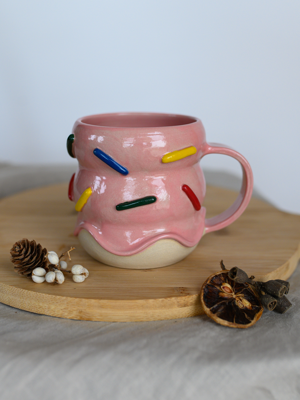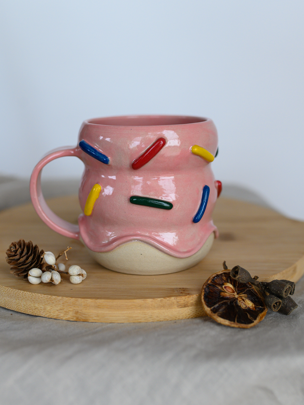 Kubek z brzuszkami pokryty szkliwem w kolorze różowym, przypominającym lukier z kolorową posypką. Uformowany na kole garncarskim z jasnej gliny.