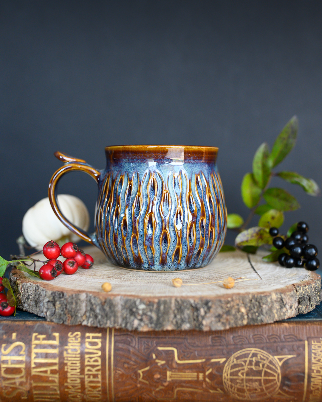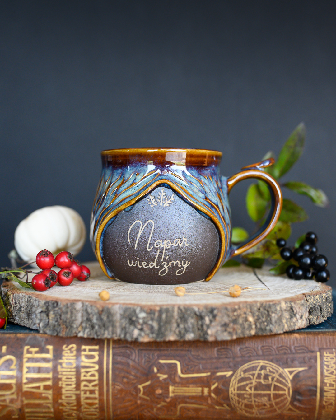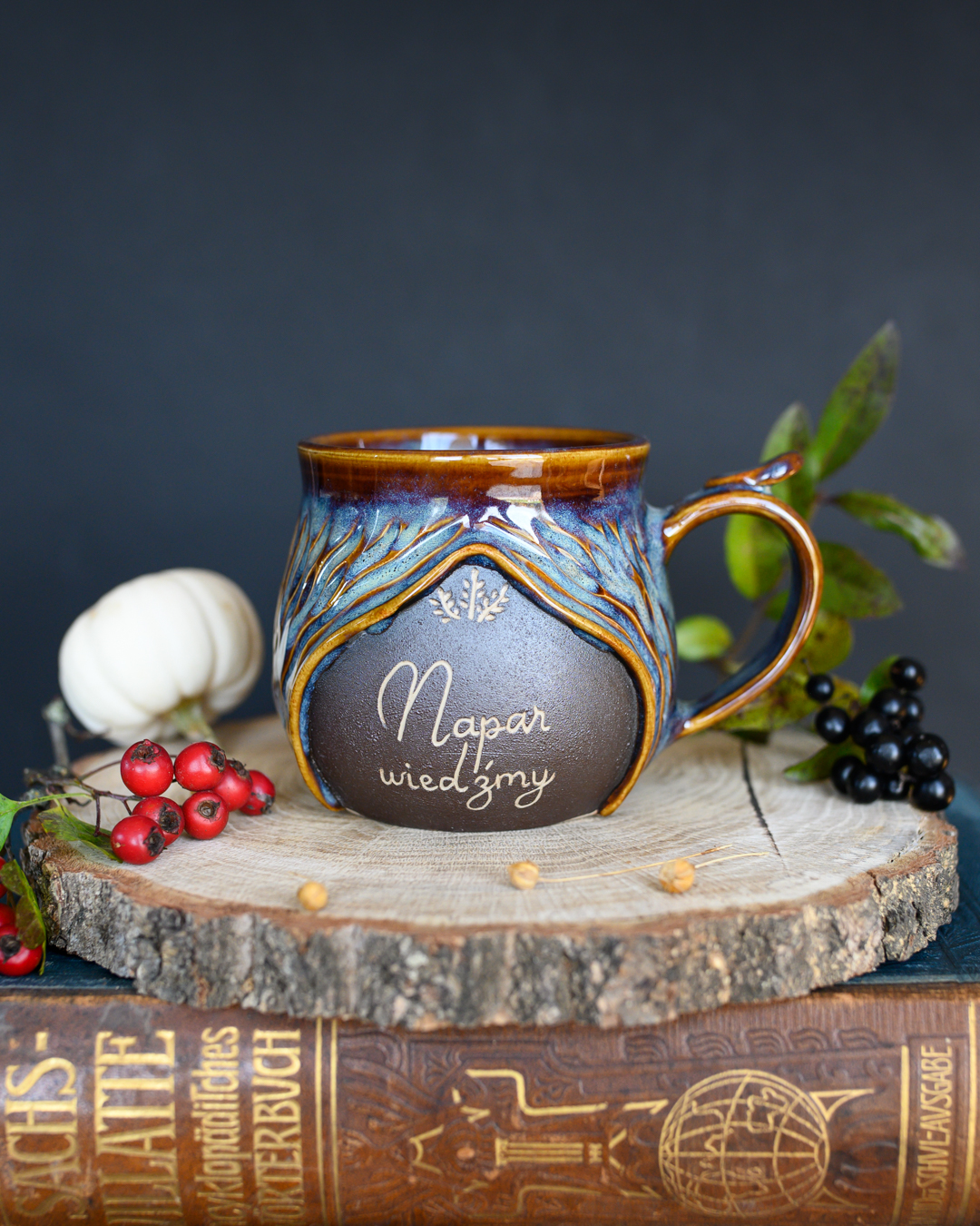Kubek ze szczyptą magii w odcieniach zieleni, niebieskości i brązu. Posiada pionowe wyżłobienia przypominającą korę drzewa oraz wygodne, ozdobne uszko. Został wykonany na kole garncarskim z jasnej gliny.