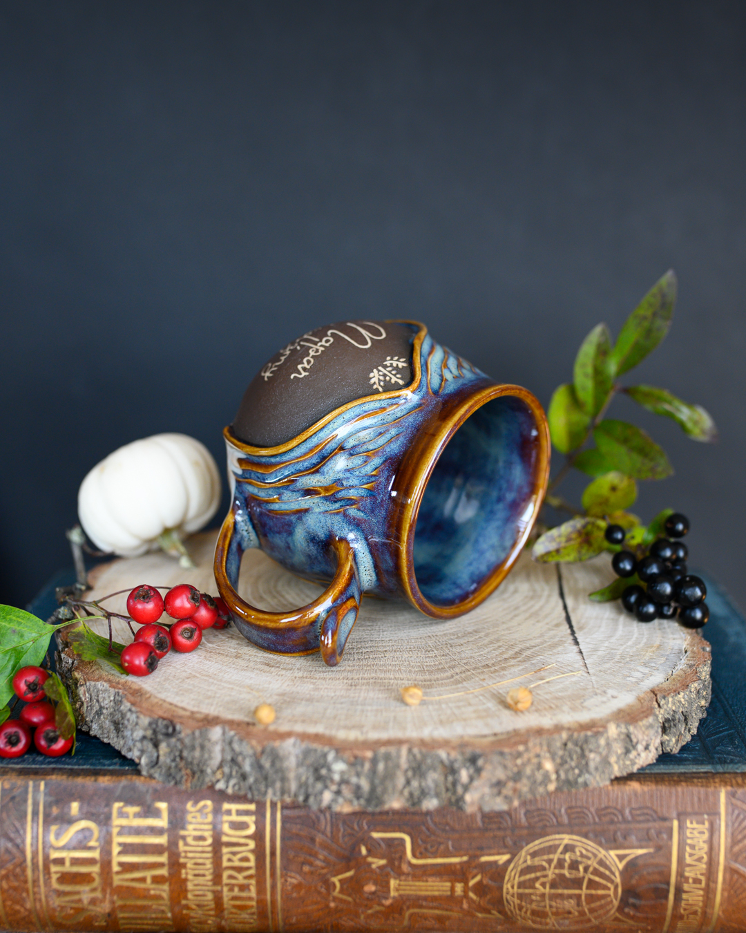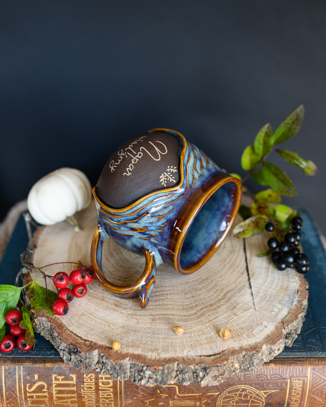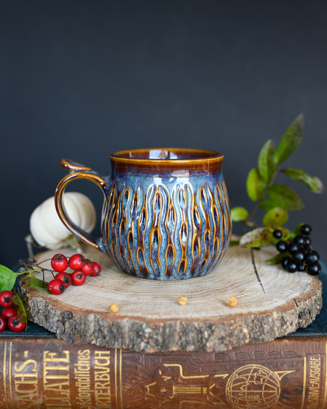 Kubek ze szczyptą magii w odcieniach zieleni, niebieskości i brązu. Posiada pionowe wyżłobienia przypominającą korę drzewa oraz wygodne, ozdobne uszko. Został wykonany na kole garncarskim z jasnej gliny.