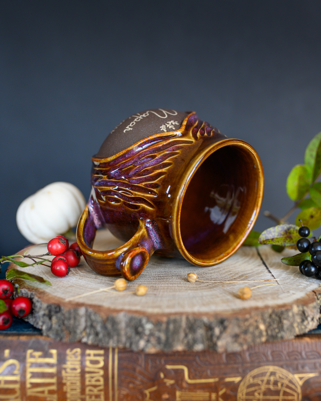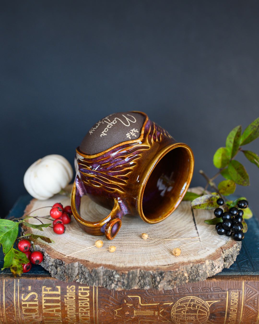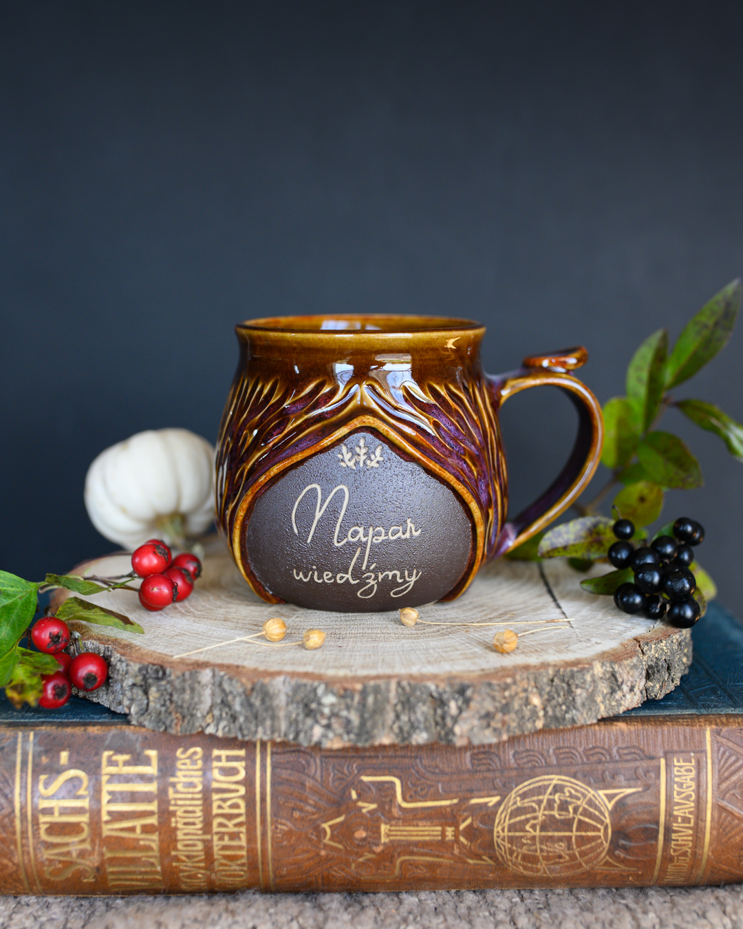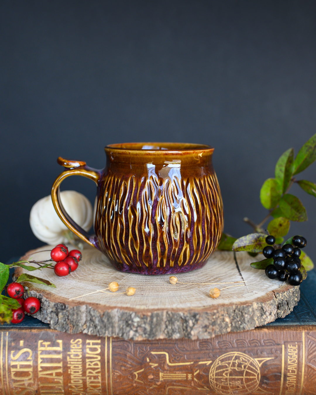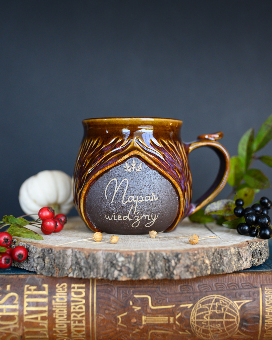 Kubek ze szczyptą magii w odcieniach brązu i różu. Posiada pionowe wyżłobienia przypominającą korę drzewa oraz wygodne, ozdobne uszko. Został wykonany na kole garncarskim z jasnej gliny.