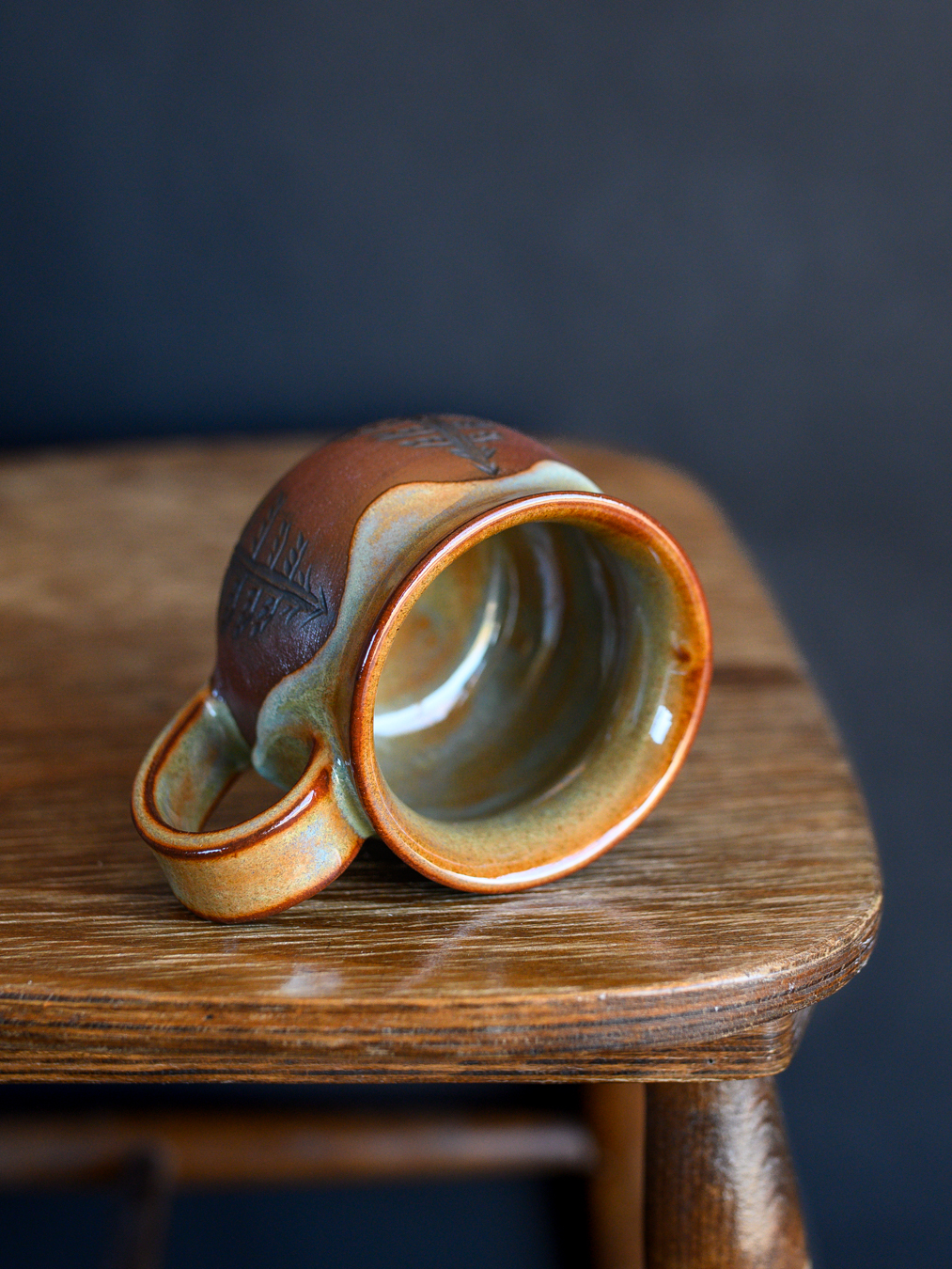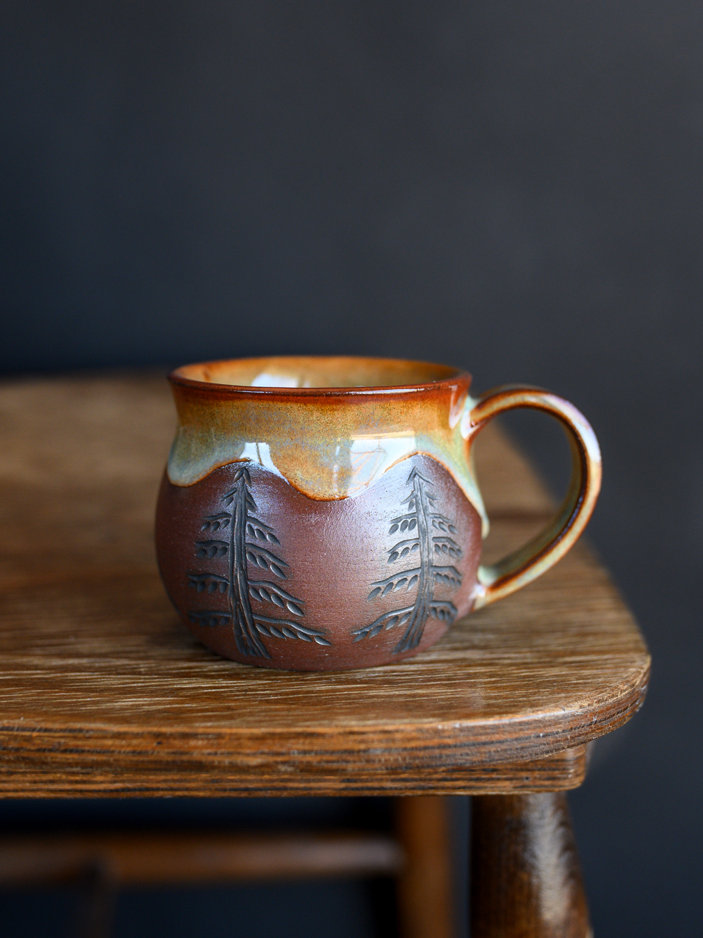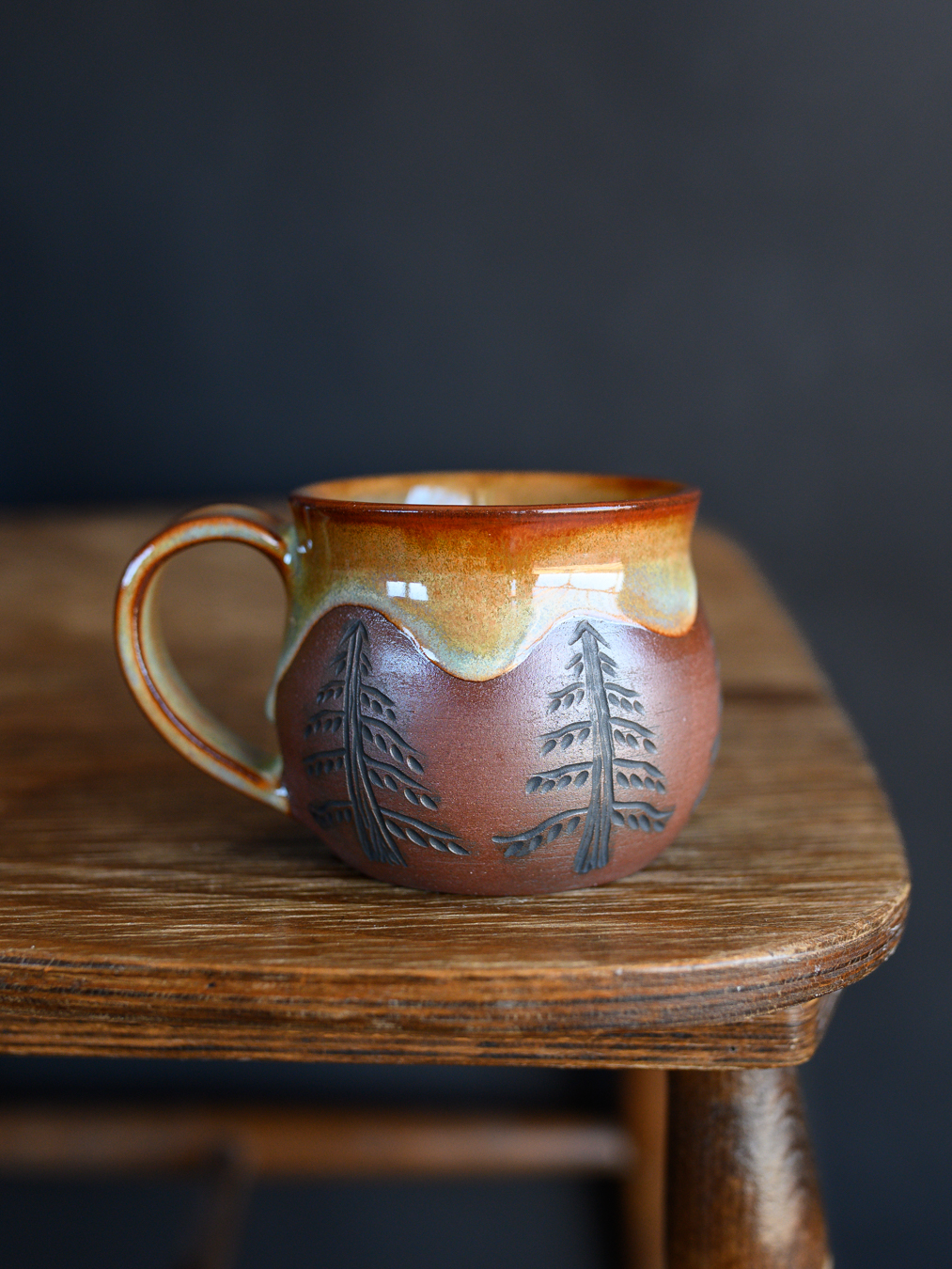 Kubek w odcieniach rudości i zieleni, ozdobiony ręcznie wykonanymi rysunkami świerków. Uformowany na kole garncarskim z czerwonej gliny.