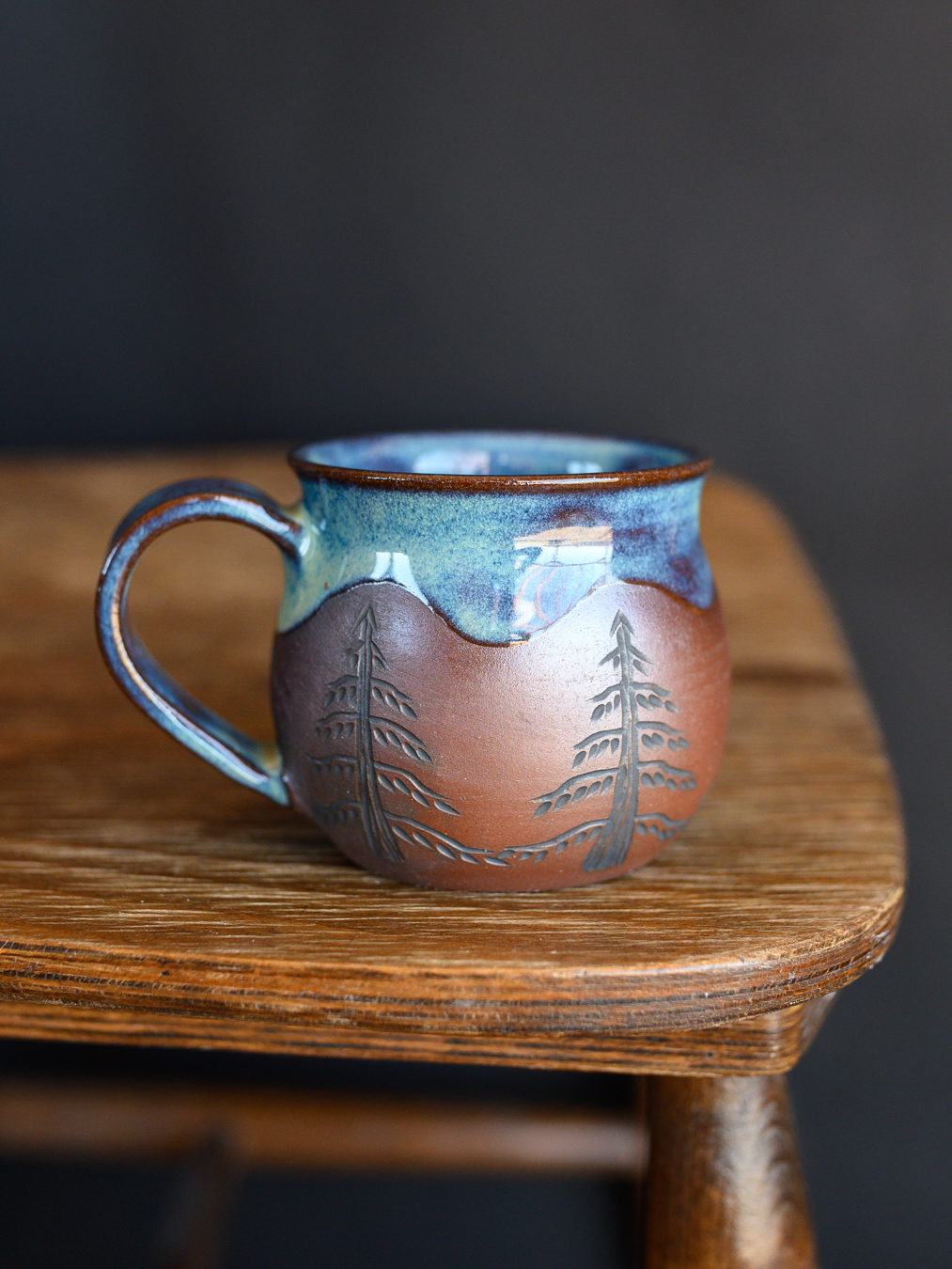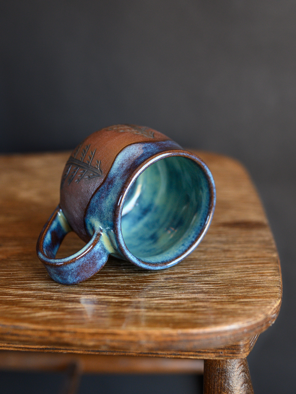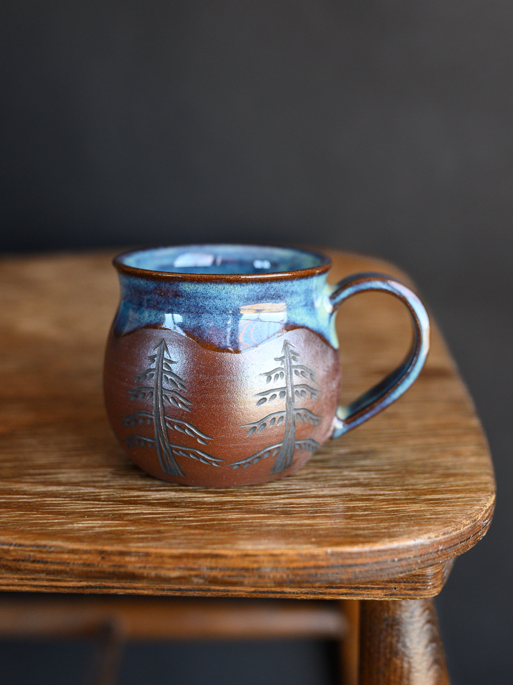 Kubek w odcieniach turkusu i niebieskości, ozdobiony ręcznie wykonanymi rysunkami świerków. Uformowany na kole garncarskim z czerwonej gliny.