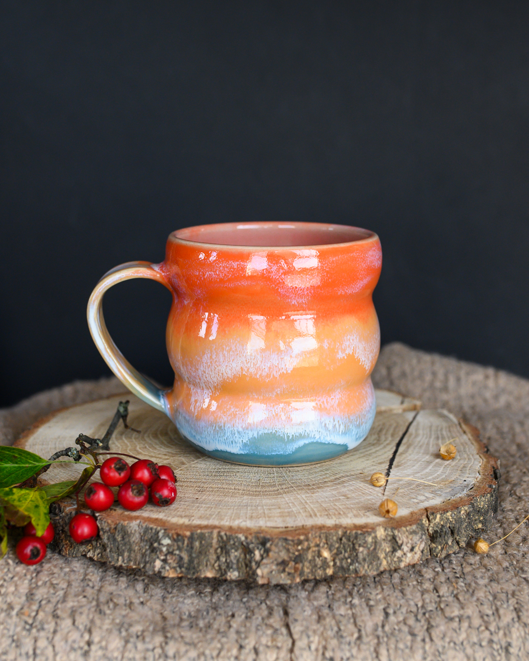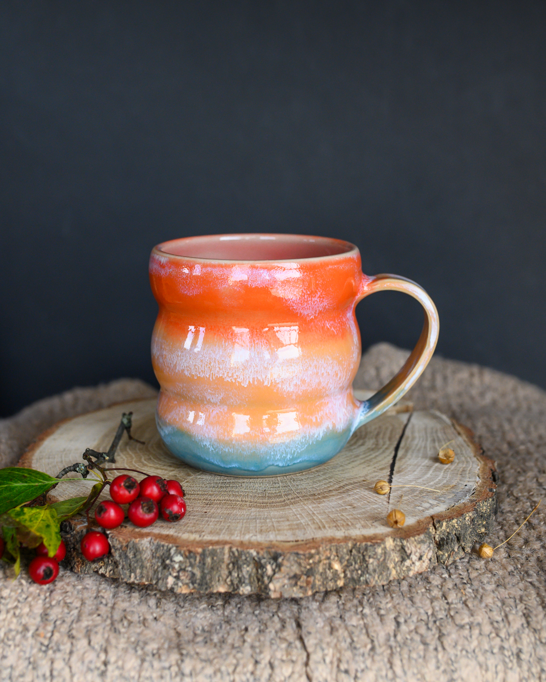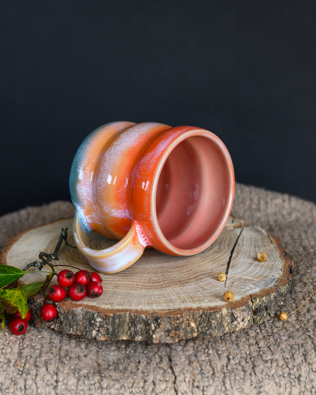 Kubek z brzuszkami w odcieniach pomarańczowego, żółtego i seledynu, uformowany na kole garncarskim z jasnej gliny.