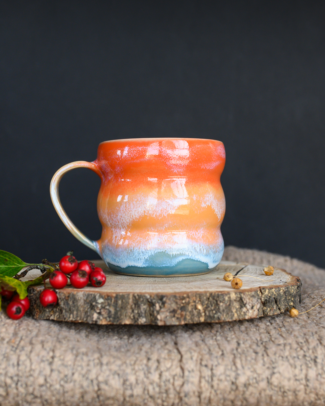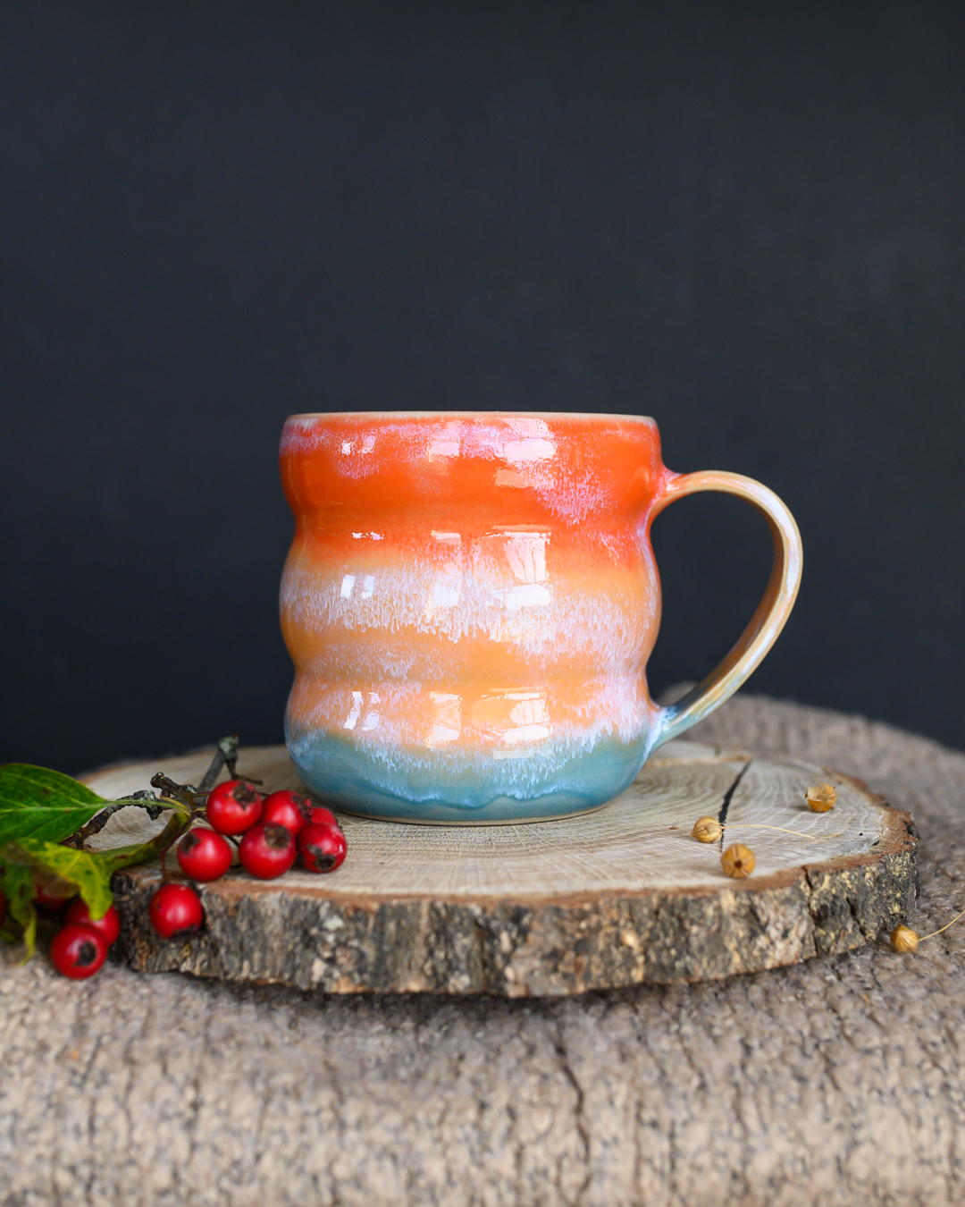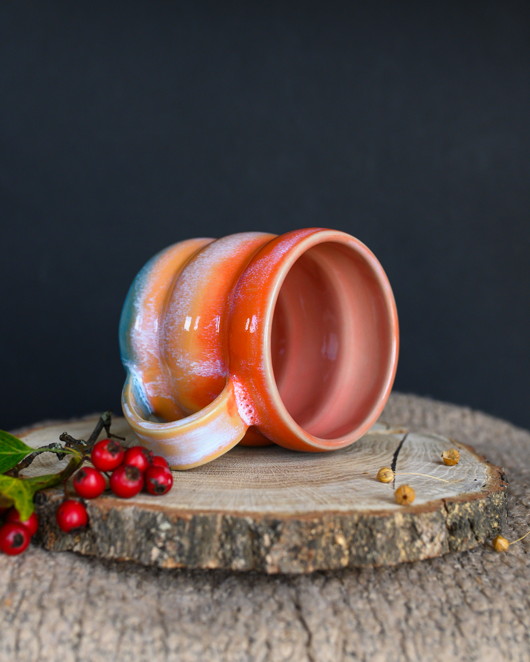 Kubek z brzuszkami w odcieniach pomarańczowego, żółtego i seledynu, uformowany na kole garncarskim z jasnej gliny.