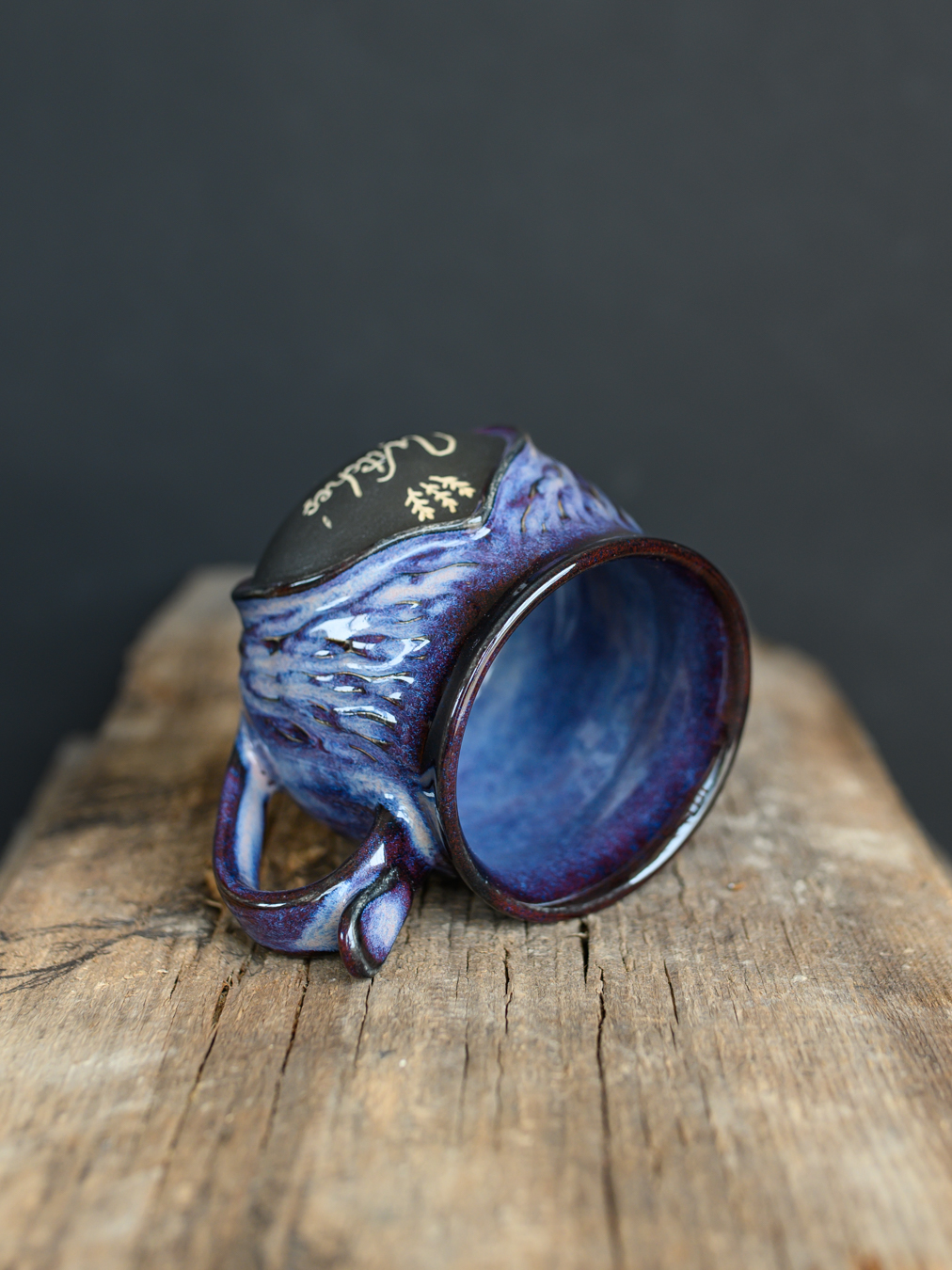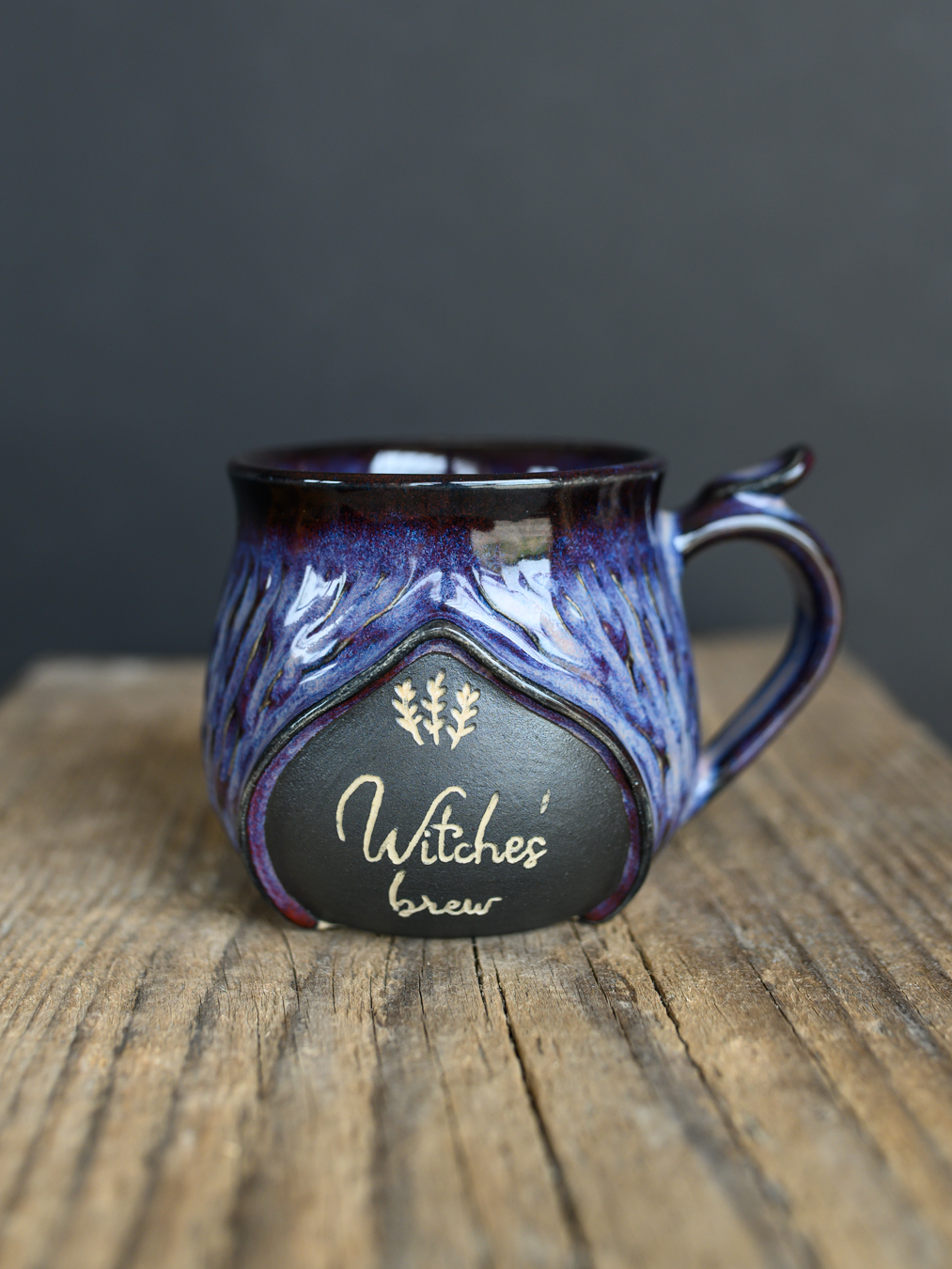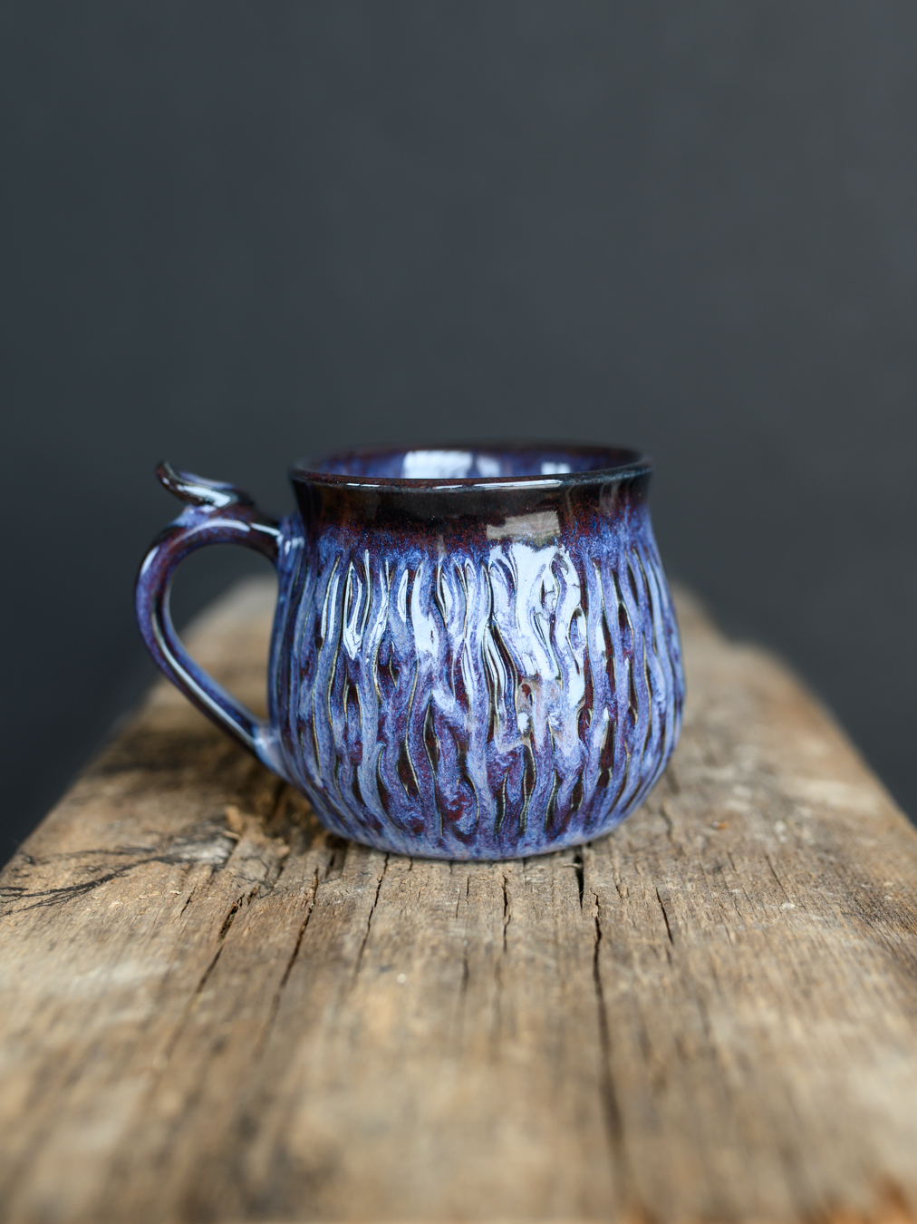 Kubek ze szczyptą magii w odcieniach fioletu i czerni. Posiada pionowe wyżłobienia przypominającą korę drzewa oraz wygodne, ozdobne uszko. Został wykonany na kole garncarskim z jasnej gliny.