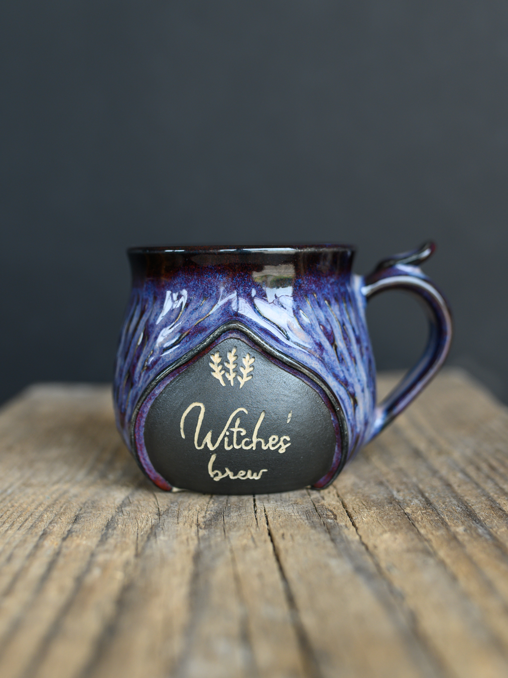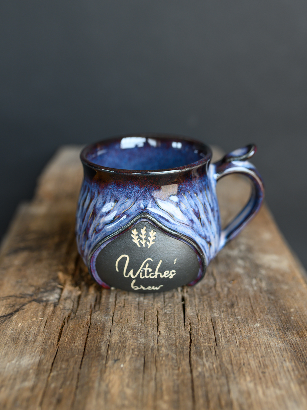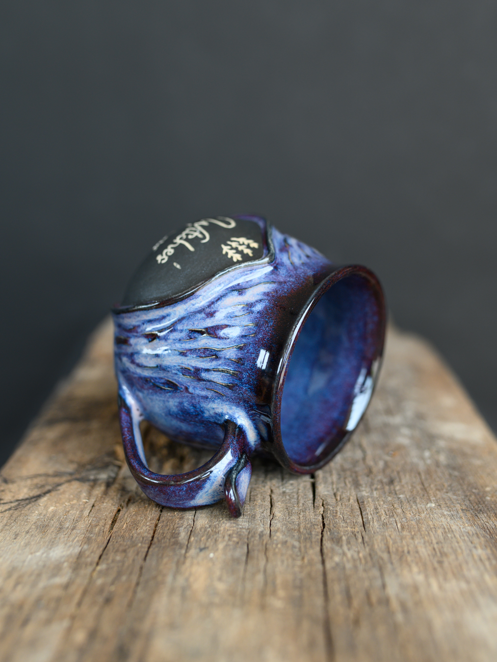 Kubek ze szczyptą magii w odcieniach fioletu i czerni. Posiada pionowe wyżłobienia przypominającą korę drzewa oraz wygodne, ozdobne uszko. Został wykonany na kole garncarskim z jasnej gliny.