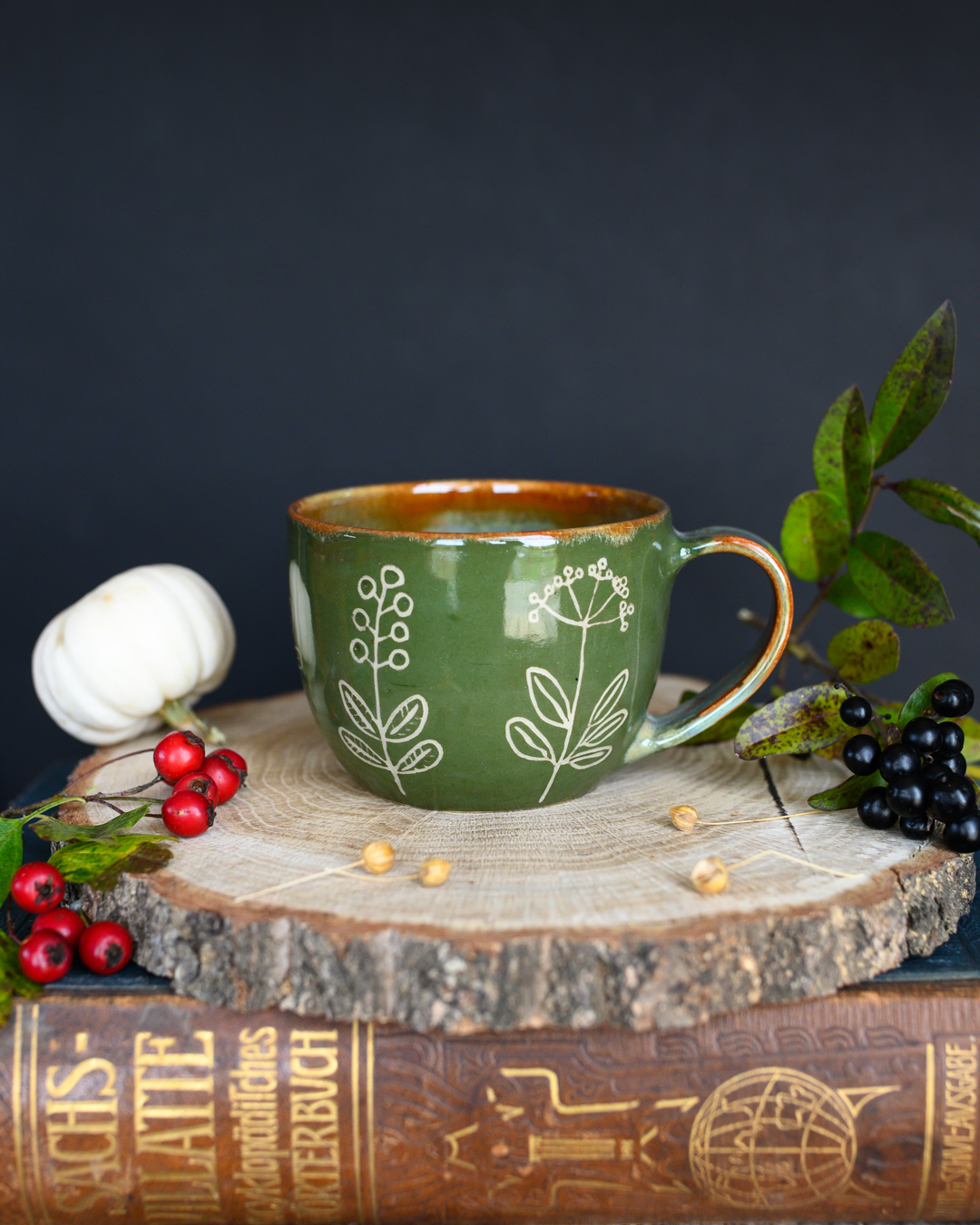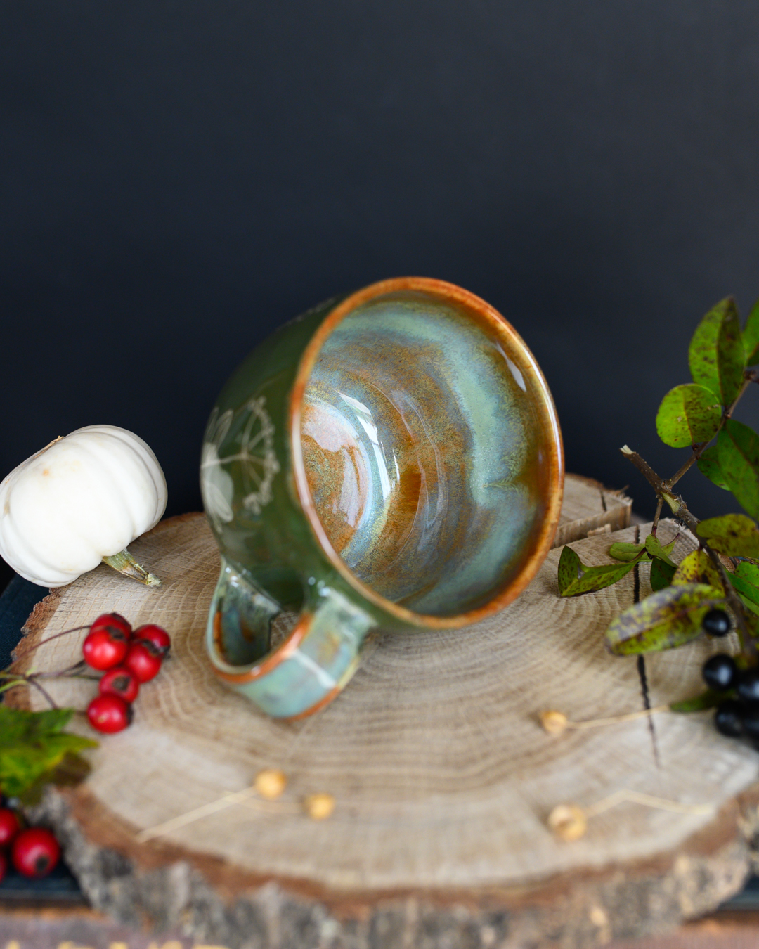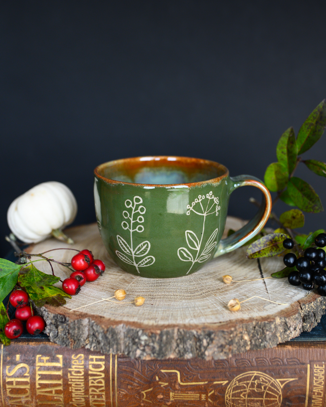 Kubek w odcieniach zieleni i brązu z ręcznie wykonanymi rysunkami ziół. Został wytoczony na kole garncarskim z jasnej gliny.