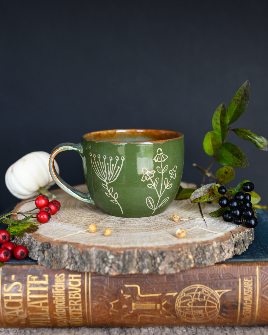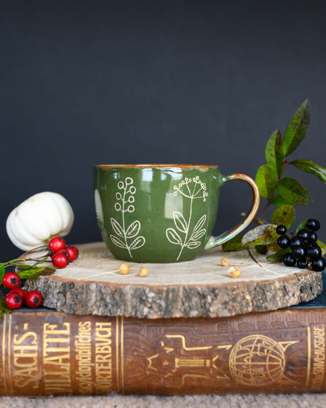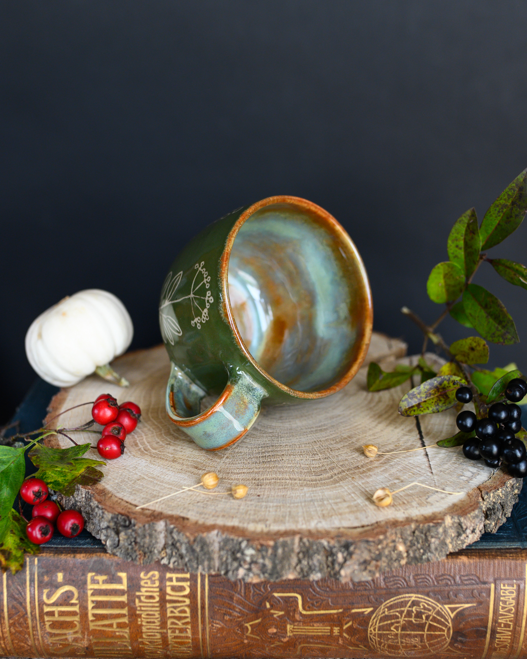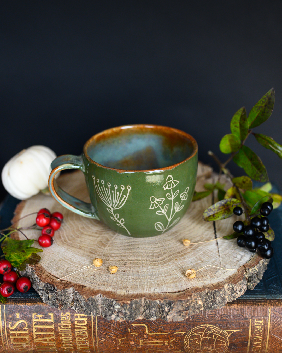 Kubek w odcieniach zieleni i brązu z ręcznie wykonanymi rysunkami ziół. Został wytoczony na kole garncarskim z jasnej gliny.