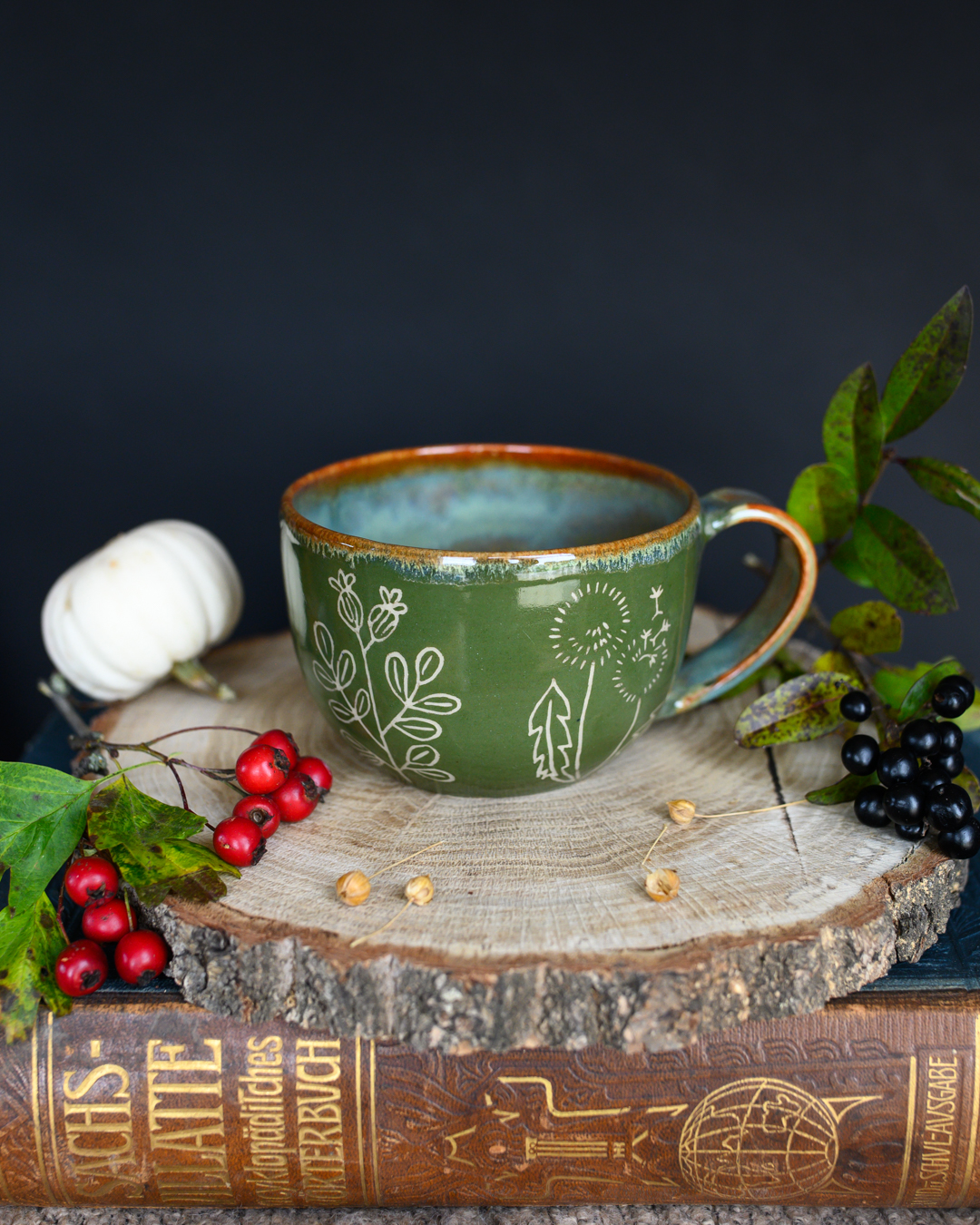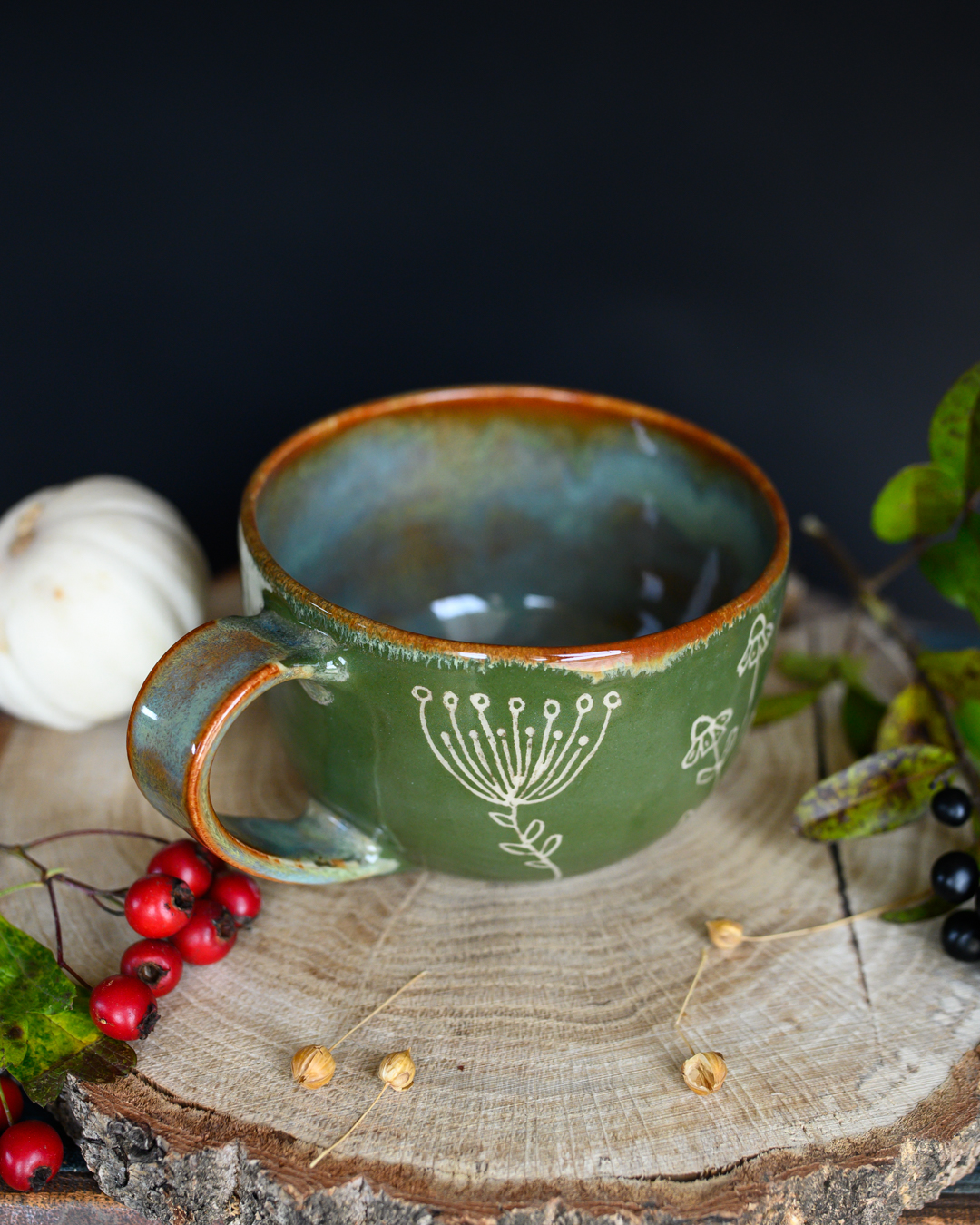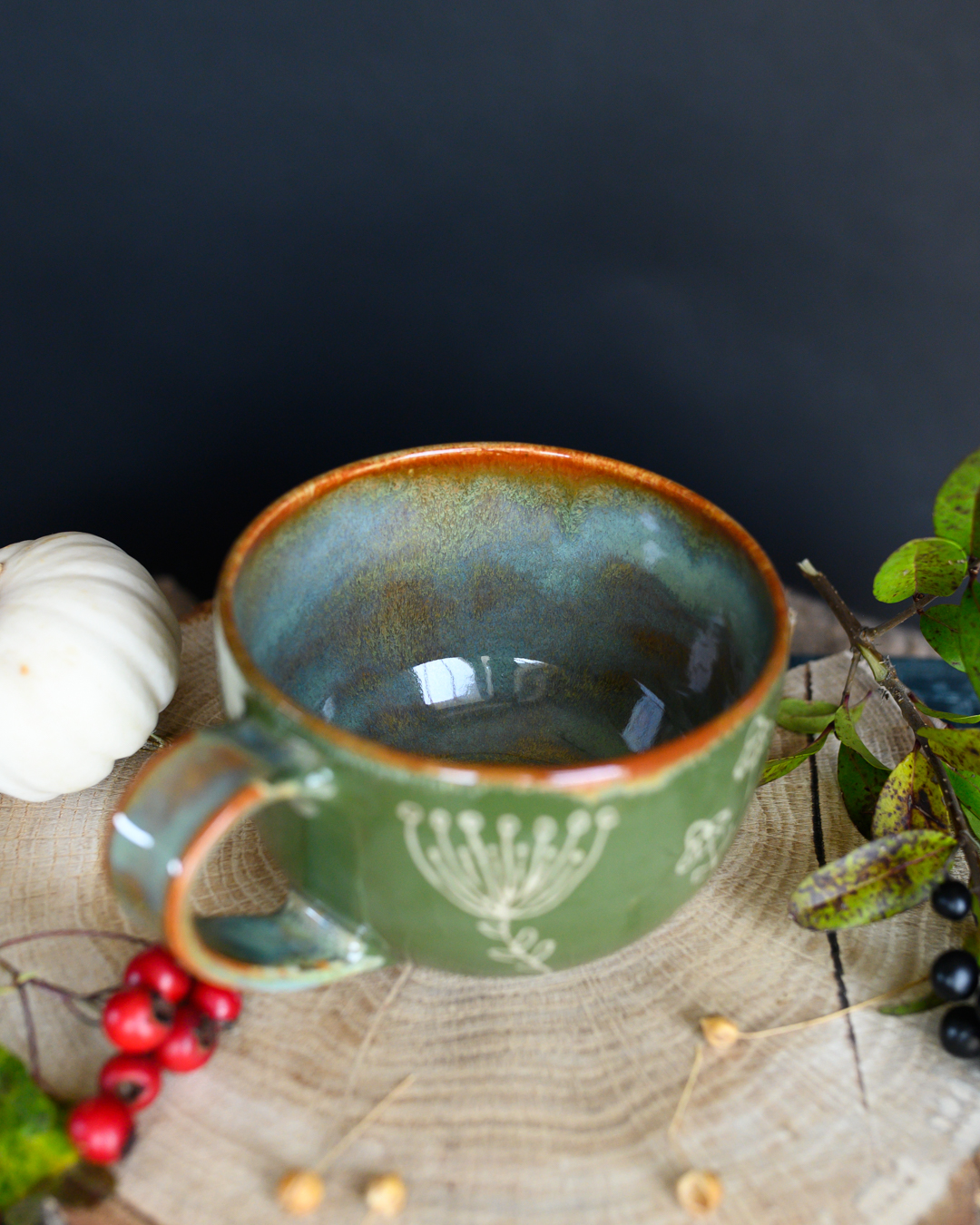 Kubek w odcieniach zieleni i brązu z ręcznie wykonanymi rysunkami ziół. Został wytoczony na kole garncarskim z jasnej gliny.