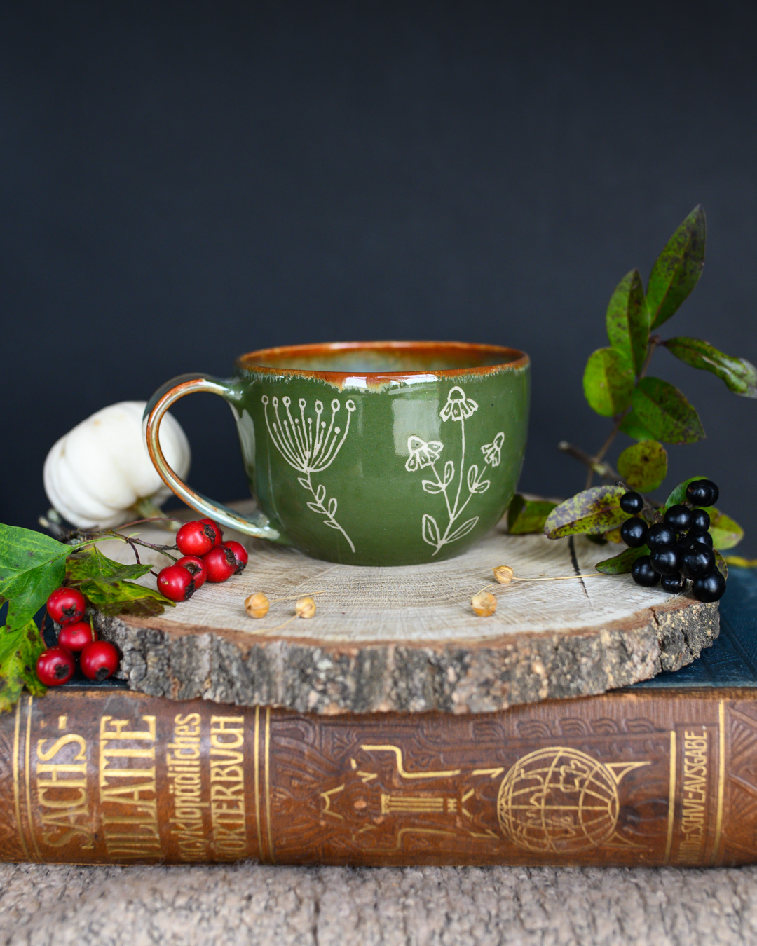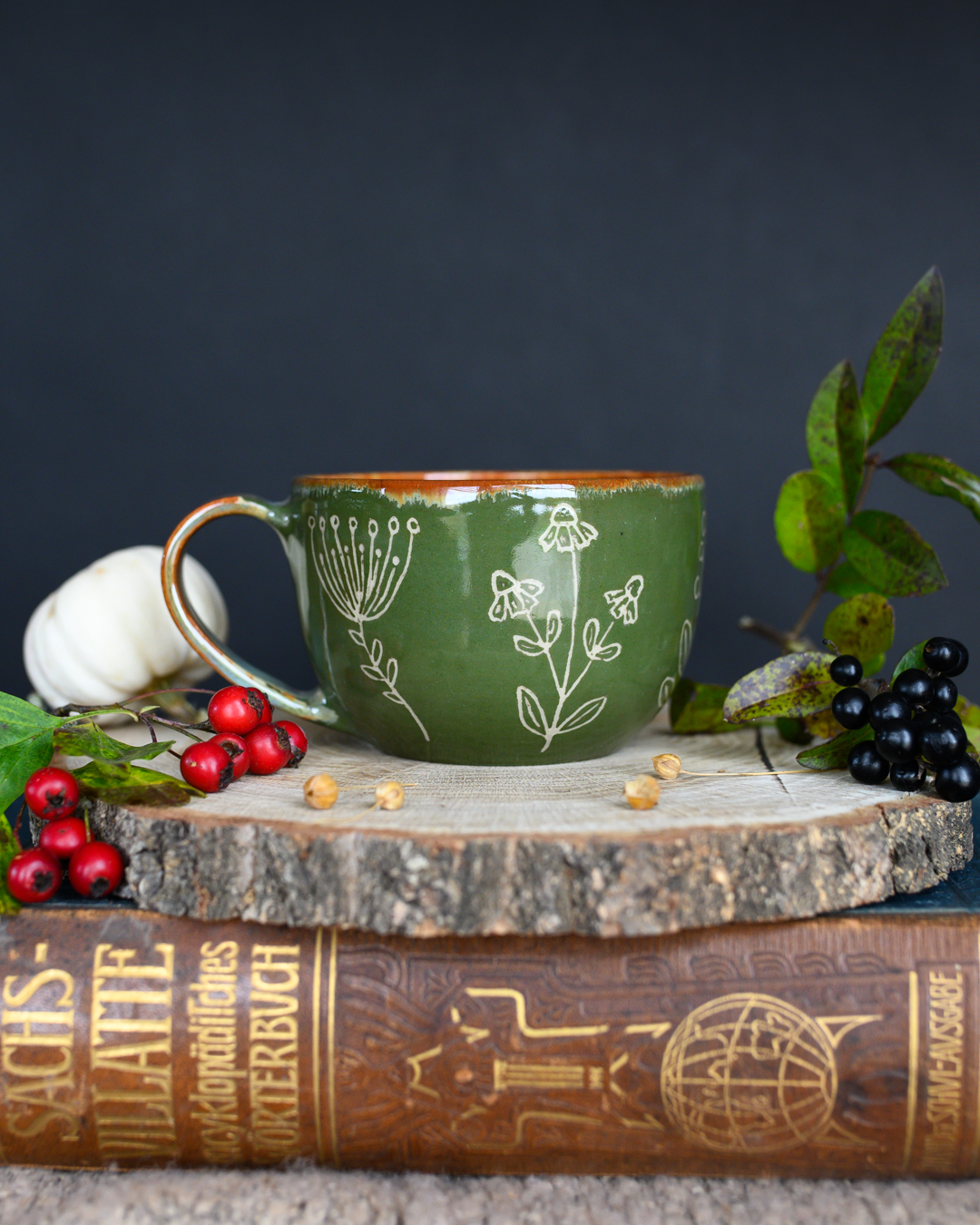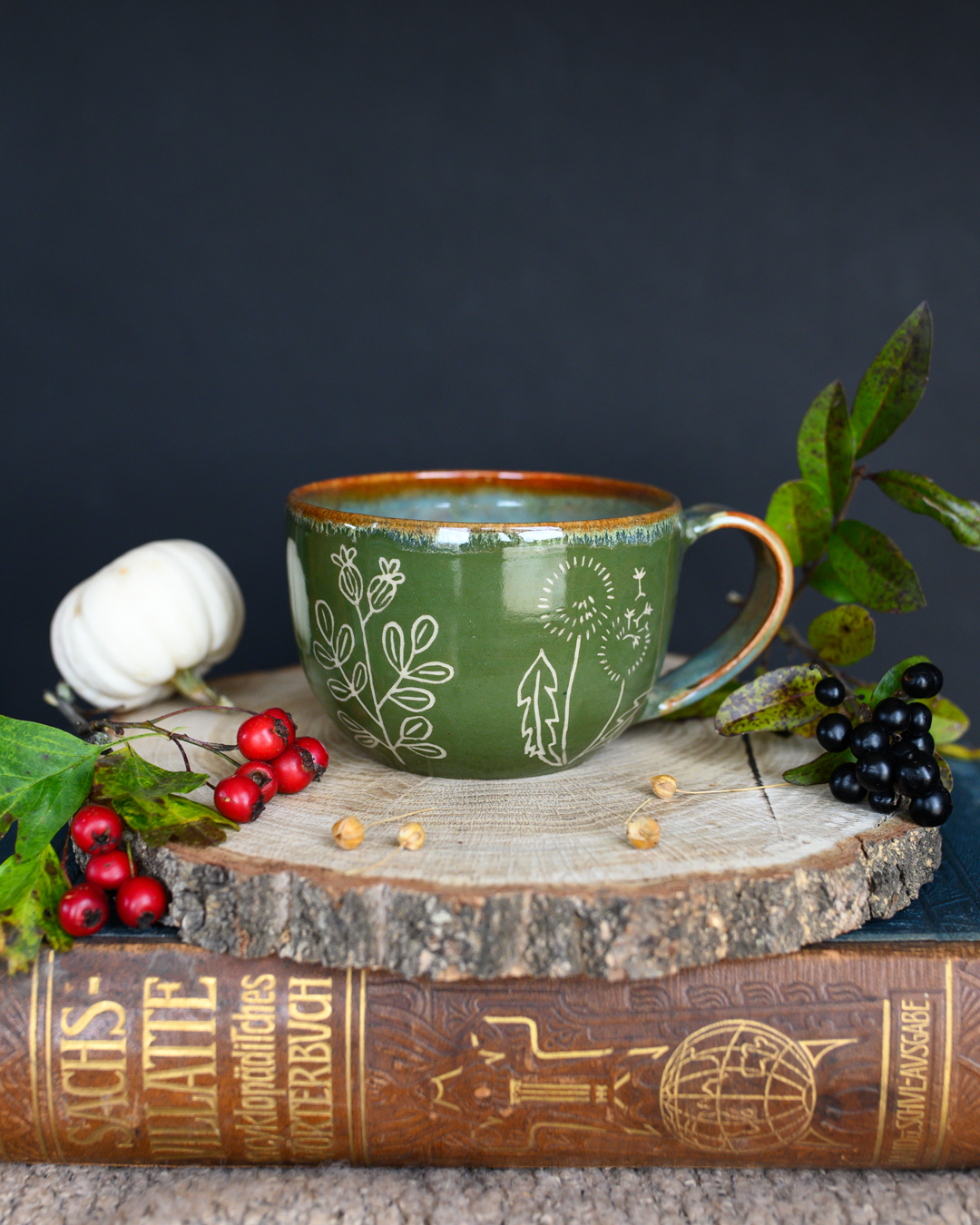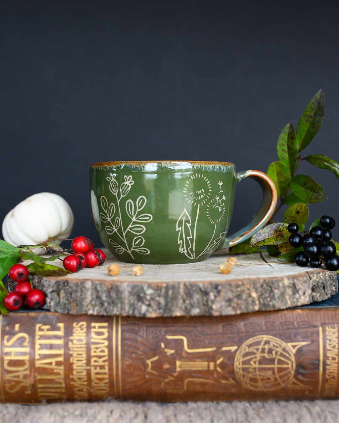 Kubek w odcieniach zieleni i brązu z ręcznie wykonanymi rysunkami ziół. Został wytoczony na kole garncarskim z jasnej gliny.